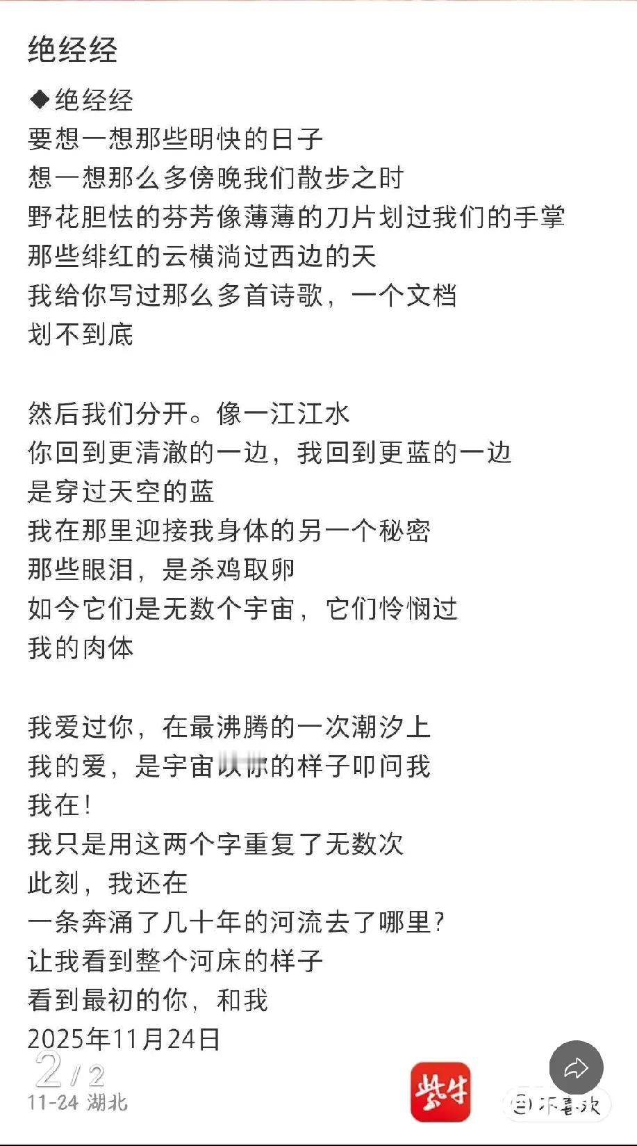 怎么看余秀华写的《绝经经》 这首诗引发了网友热烈的讨论,有网友在评论区调侃道:“余老师,您这是把‘绝经’写成了‘绝景’啊!”“率真自我,一往无敌”,还有网友表示,余秀华的诗歌让他们对绝经这一生理现象有了新的认识。 大多数网友认为,余秀华敢于公开谈论绝经并将其写入诗歌,是一种非常勇敢的行为。 有网友留言:“在这个对女性身体充满偏见的社会里,余老师敢于直面自己的身体变化,真的很了不起。”然而,也有一些评价的声音比较刺耳,认为余秀华这首诗不登大雅之堂,一位网友留言评价:“低俗”“想博流量有意义吗?”余秀华也在评论区回应了这条评论:“如果这都低俗,你就不应该来人间。” 还有网友评价说:“余老师绝经一诗,立意不高。”“比尿尿有高度”“秀华老师,懂流量。”