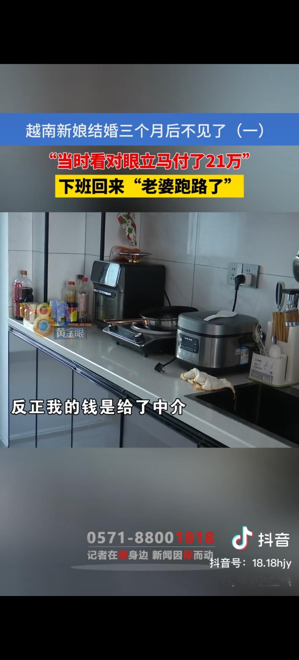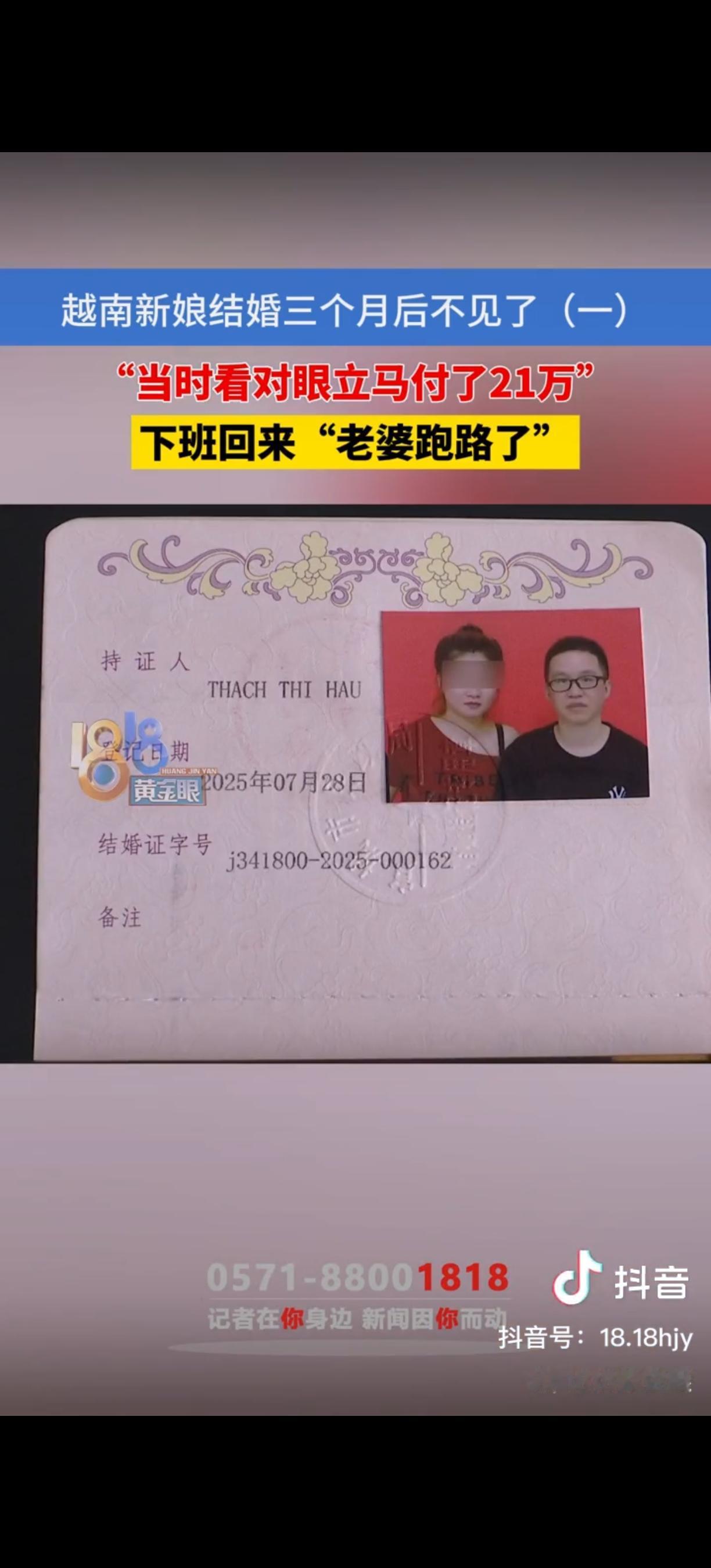 浙江杭州,40岁的胡师傅花21万娶了一位20岁的越南新娘,婚后发现妻子一直在吃避孕药,妻子解释是调节月经。可结婚才3个月,妻子突然不见了。胡师傅心痛得一个星期缓不过来,妻子做的饭菜都长毛了也舍不得倒掉。他找介绍人,对方却说都是他的责任。胡师傅很疑惑:妻子护照在自己手里,她语言不通,也没熟人,怎么就出远门了?他怀疑自己被“诈婚”了! 胡师傅是杭州的一名模具工,月收入一万多,因为一直单身,就通过安徽老乡介绍,认识了这位越南姑娘。两人“看对眼”后,他爽快地拿出21万彩礼,其中16万是现金,剩下的通过转账给了介绍人。 婚后,胡师傅发现妻子偷偷吃一种白色药片,问她是什么,妻子说是调节月经的药,他当时也没多想。 男主外,女主内。他以为以后会一直的这样幸福下去。可没成想,才过了三个月,妻子就突然消失了。 胡师傅下班回到家,看到桌子上妻子做的饭菜都已经长毛了,却怎么也舍不得倒掉,就那么放着,仿佛妻子还会回来一样。他赶紧联系介绍人,可介绍人却把责任都推到他身上,说他肯定是哪里做得不好,才把媳妇气跑了。 胡师傅越想越觉得不对劲。他手里拿着妻子的护照,妻子语言不通,在杭州也没有熟人,怎么可能一下子就消失得无影无踪呢?他怀疑自己是被“诈婚”了,那21万彩礼打了水漂。 他尝试联系妻子,可妻子的手机关机,微信也把他拉黑了。他又联系介绍人的妻子丽丽,丽丽说自己也联系不上胡师傅的妻子,还说女方父母也在找女儿。 这事传开后,有人觉得胡师傅太轻信他人,跨国婚姻风险本来就大,还花这么多钱,肯定容易被骗;也有人说,这介绍人肯定有问题,说不定就是和那越南姑娘一伙的,专门骗彩礼钱。 胡师傅现在是又伤心又愤怒,他不知道该去哪里找妻子,也不知道这21万能不能追回来。他只希望能找到妻子,或者让那些骗人的人得到应有的惩罚。 各位读者你们怎么看?欢迎在评论区讨论。 来源:1818黄金眼 2025-11-27采访