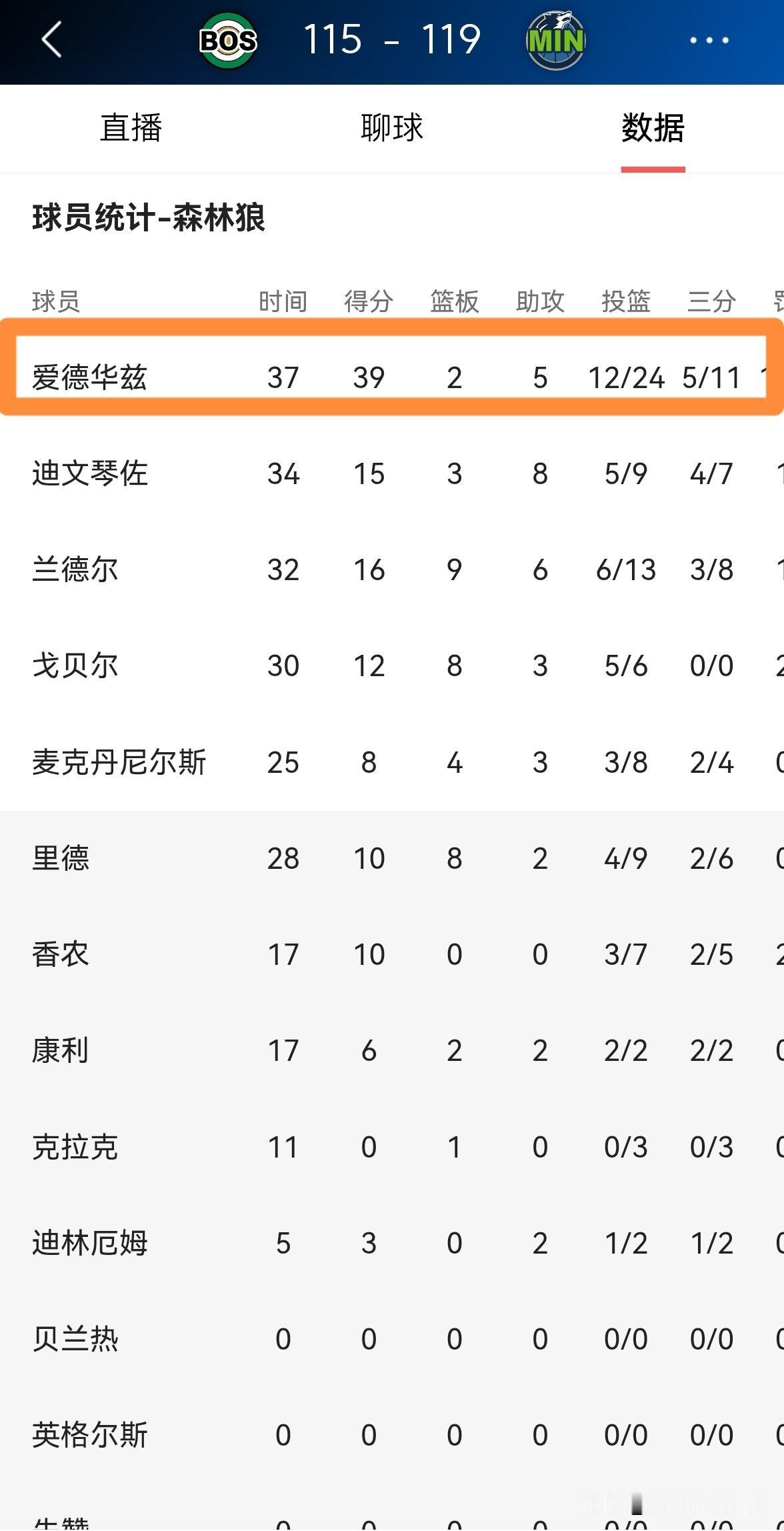 我彻底的被森林狼巨星爱德华兹征服了!在今天森林狼主场以119:115险胜凯尔特人的比赛中,爱德华兹打出了让人心服口服的表现。 全场比赛下来,爱德华兹首发出战37分钟,投篮24中12,其中三分球11中5、罚球11中10爆砍39分5助攻1盖帽0失误。值得一提的是,在比赛的最后时刻,爱德华兹一击致命投进了一记杀死比赛的极限压哨三分。 本场比赛,爱德华兹的表现堪称完美,他是球队能够获胜的最大功臣。