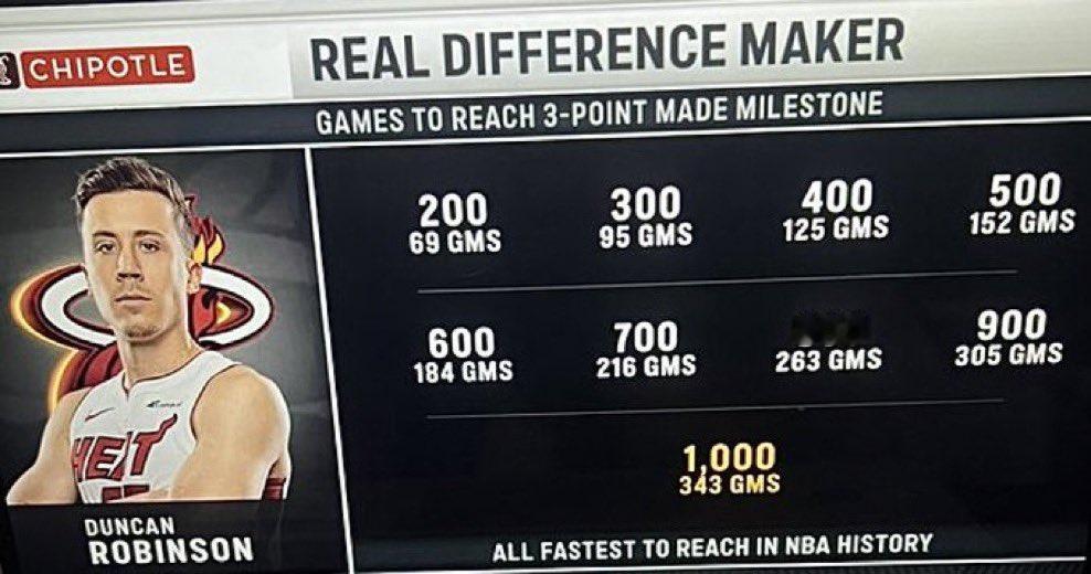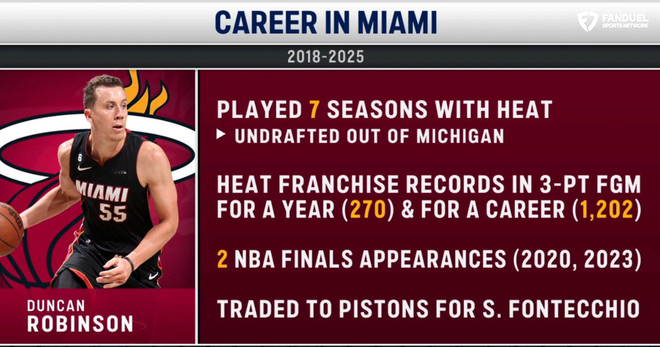 邓肯·罗宾逊迈阿密生涯(2018–2025)效力热火 7 个赛季🔥密歇根大学落选秀出身热火队史三分命中数纪录保持者🔥 单赛季命中数:270 个🔥生涯命中数:1,202 个两次闯入 NBA 总决赛(2020、2023)活塞vs热火 邓肯罗宾逊