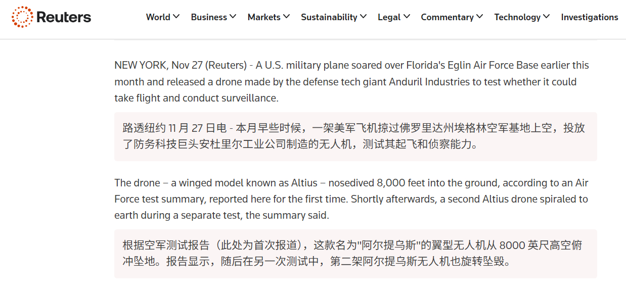 🔻美国国防承包商安杜里尔工业公司遭遇无人机坠毁挫折,包括近期空军测试中的事故。🔻本月早些时候,一架美军飞机掠过佛罗里达州埃格林空军基地上空,投放了防务科技巨头安杜里尔工业公司制造的无人机,测试其起飞和侦察能力。🔻根据空军测试报告,这款名为"阿尔提乌斯"的翼型无人机从 8000 英尺高空俯冲坠地。报告显示,随后在另一次测试中,第二架阿尔提乌斯无人机也旋转坠毁。🔻台伪军对路透证实今年接收了 131 架安杜里无人机,但拒绝评论装备性能。🔻就这玩意儿,乐。热点现场海外新鲜事