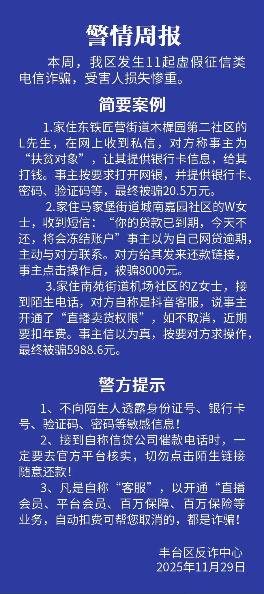 电诈依然猖獗,这是北京丰台辖区11月29日通报的几起被骗案例。第一个案例令人哭笑不得,以扶贫的名义被骗20.5万。明明都有很多积蓄,却还贪心扶贫款、物,结果上了骗子的当,把自己的银行卡、网银、密码、验证码和盘托出。骗子的手段高明吗?一点也不,但是就有人上当,贪欲真的无法战胜吗?