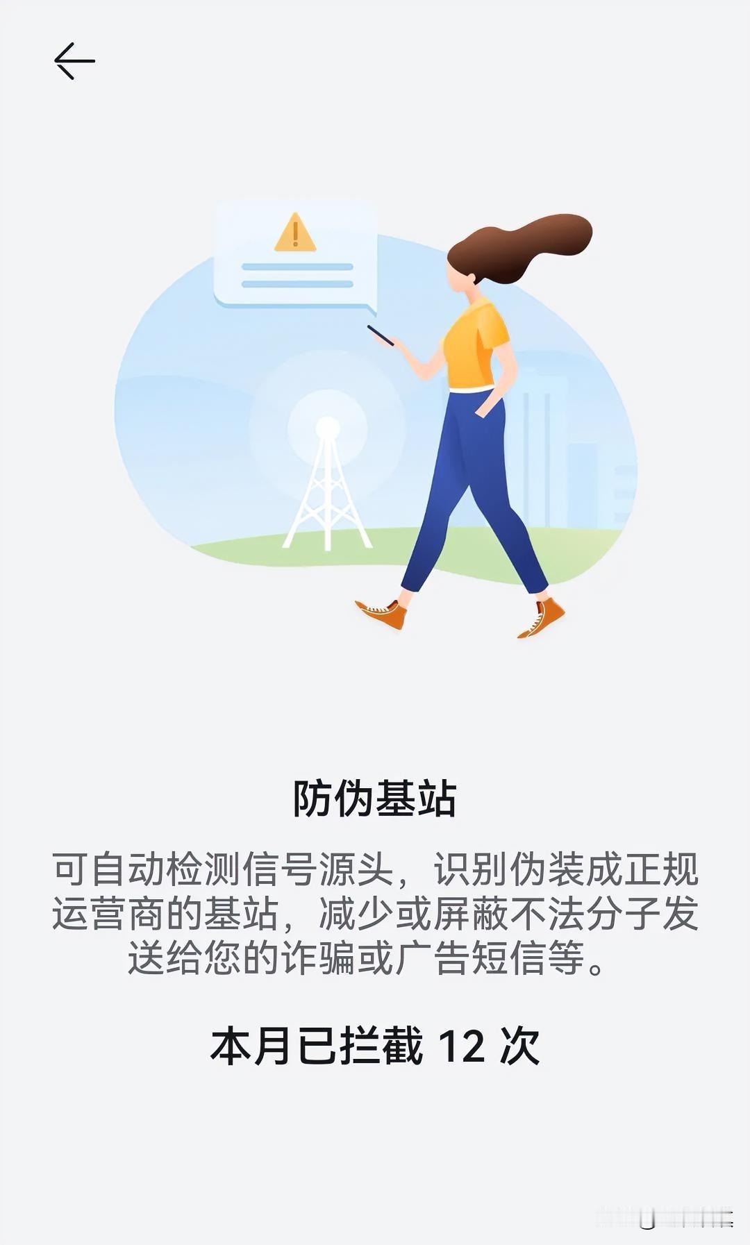现在的社会真的防不胜防,不是说人人都要实名认证的吗?为什么还会这样呢? 这是荣耀手机告诉我的,防伪基站,可自动检测信号源头,识别伪装成正规运营商的基站,减少或屏蔽不法分子发送给您的诈骗或广告短信等,本月已经拦截12次了。难道三大运营商没有办法进一步追踪一下,现在时时刻刻到处都是虚拟电话、诈骗电话、骚扰电话等等! 友友们,你经常也有接到这些烦人的电话吗?