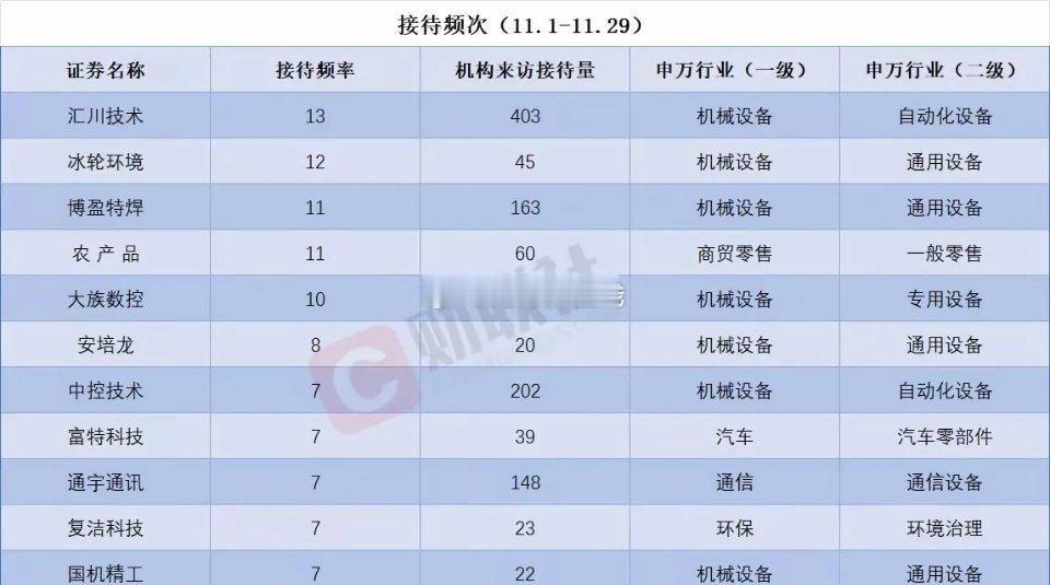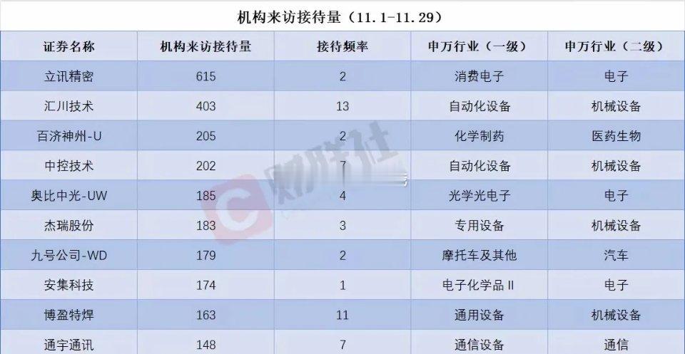 最新机构调研公司梳理!11月1日-29日的机构调研数据,涵盖消费电子、机械设备、医药生物等多行业个股,核心展示了机构来访接待量与接待频次——立讯精密接待量居首,汇川技术接待频次最高,机械设备行业个股在调研中占比突出,这些数据反映了机构对不同行业、个股的关注程度差异。个股梳理分析1. 立讯精密:11.1-11.29机构接待量615(同期最高)、频次2次,属消费电子(一级)、电子(二级)行业,作为消费电子龙头,高接待量体现市场对其业务布局、行业地位的重点关注。2. 汇川技术:接待量403、频次13次(同期最高),属机械设备(一级)、自动化设备(二级),是自动化设备领域龙头,高频高量调研反映机构对其技术拓展、行业需求的持续关注。3. 百济神州-U:接待量205、频次2次,属化学制药(一级)、医药生物(二级),作为创新药企,机构调研或聚焦其药物研发进展、商业化落地等核心业务方向。4. 中控技术:接待量202、频次7次,属机械设备(一级)、自动化设备(二级),专注工业自动化领域,机构调研或围绕其技术壁垒、下游行业拓展情况展开。5. 奥比中光-UW:接待量185、频次4次,属光学光电子(一级)、电子(二级),聚焦3D视觉技术,机构关注或与其在光学领域的应用场景、技术迭代相关。6. 杰瑞股份:接待量183、频次3次,属专用设备(一级)、机械设备(二级),是油气装备龙头,机构调研或涉及行业需求变化、其业务拓展节奏。7. 九号公司-WD:接待量179、频次2次,属摩托车及其他(一级)、汽车(二级),主打智能短交通产品,机构关注或围绕其消费端表现、创新产品布局。8. 安集科技:接待量174、频次1次,属电子化学品Ⅱ(一级)、电子(二级),专注半导体材料领域,单次高接待量体现机构对其细分赛道发展的集中关注。9. 博盈特焊:接待量163、频次11次,属通用设备(一级)、机械设备(二级),聚焦特种焊接领域,高频次调研反映机构对其技术优势、业务增长的持续跟踪。10. 通宇通讯:接待量148、频次7次,属通信设备(一级)、通信(二级),主营通信天线,机构调研或围绕其通信业务的市场拓展、技术升级方向。11. 容百科技:接待量140、频次1次,属电池(一级)、电力设备(二级),是锂电池材料供应商,单次高接待量体现机构对其新能源材料业务的关注。12. 冰轮环境:接待频次12次、量45,属通用设备(一级)、机械设备(二级),涉及制冷装备领域,高频调研或聚焦其业务升级、新兴领域布局。13. 农产品:接待频次11次、量60,属商贸零售(一级)、一般零售(二级),主营农产品流通,机构关注或围绕其业务模式、行业政策影响。14. 大族数控:接待频次10次、量32,属专用设备(一级)、机械设备(二级),专注PCB设备领域,机构调研或涉及行业景气度、市场份额变化。15. 安培龙:接待频次8次、量20,属通用设备(一级)、机械设备(二级),聚焦传感器产品,机构关注或与其产品应用场景、技术优势相关。16. 富特科技:接待频次7次、量39,属汽车(一级)、汽车零部件(二级),主营汽车零部件,机构调研或围绕其配套客户、增长潜力展开。17. 复洁科技:接待频次7次、量23,属环保(一级)、环境治理(二级),专注环保装备icon,机构关注或涉及项目落地、政策红利影响。18. 国机精工:接待频次7次、量22,属通用设备(一级)、机械设备(二级),涉及精密轴承部件,机构调研或围绕其研发进展、竞争格局。19. 白云机场:接待频次7次、量40,属交通运输(一级)、航空机场(二级),作为航空枢纽,机构关注或涉及客流恢复、机场运营情况。