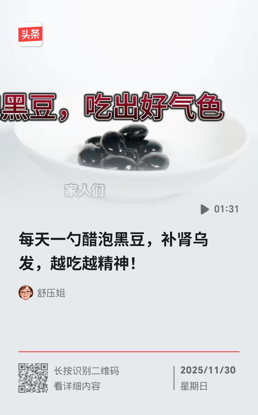 黑豆才是“养生王”!搭配这几样吃,补肾乌发强筋骨,越吃越显年轻 小区王阿姨坚持吃黑豆搭配餐,半年后头发黑了不少,爬楼梯也不喘了!原来黑豆单独吃营养吸收差,跟这些常见食材搭着吃,补肾效果翻倍,还能抗衰老,全家都能吃! 黑豆本身就是好东西,富含蛋白和花青素,但单吃总觉得差点意思。分享3款家常做法,简单易操作,厨房小白也能搞定! 早餐喝三黑红枣花生浆,省事又营养。抓一把黑豆、黑米、黑芝麻各30g,再放几颗红枣和花生,洗净后全倒进破壁机,加700ml清水,按“豆浆模式”,坐等20分钟就能喝。香浓丝滑,不用额外加糖,红枣和花生的甜味刚好,喝着暖胃,补肾益精还能养气色,女生喝了皮肤都透亮。 全家聚餐煮黑豆莲藕山药板栗汤,鲜到舔碗。猪肉切块焯水去血沫,莲藕去皮切块,山药切小段,再准备30g黑豆、100g板栗、5颗红枣和50g核桃,全放进砂锅,加足量清水。大火烧开转小火炖1小时,最后加盐调味就行。汤里满是食材的鲜香,山药软糯、板栗香甜,喝着不油腻,补肾强腰还能强筋骨,老人孩子都爱吃。 想喝粥就做五黑养生粥,暖乎乎超舒服。黑豆、黑米各30g,黑芝麻、花生、糯米各20g,洗净后加水800ml,大火烧开转小火慢熬50分钟,煮到粥体浓稠。喜欢甜口就加块冰糖,软糯香甜,健脾养胃又乌发,早上喝一碗,一整天都有精神。 还有懒人版五黑豆浆,适合上班党。黑豆、紫米各20g,核桃、黑桑葚各10g,加1g黑枸杞,洗净后加600ml水,放进破壁机打匀,健脑益智还能养发,随手带一杯,营养不耽误。 不用买贵巴巴的保健品,日常用黑豆搭配这些食材,坚持吃一段时间,精力变足,头发也有光泽。你平时怎么吃黑豆?有没有私藏的搭配方法?评论区分享下,让大家一起解锁养生新吃法!黑豆饮食益处 黑豆饮食益处 养生黑豆 黑豆煮水 食用黑豆