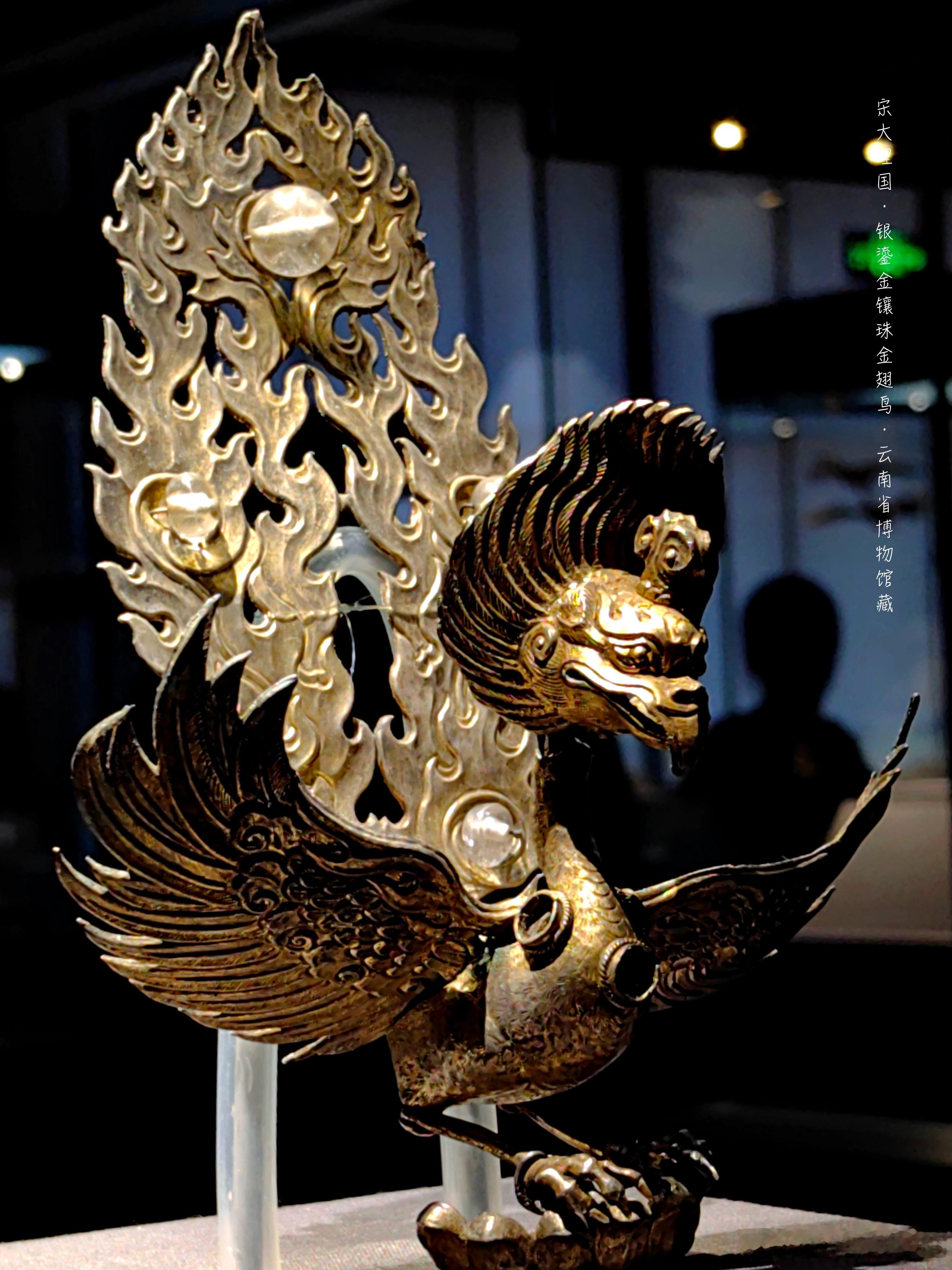 银鎏金镶珠金翅鸟宋大理国时期云南省博物馆藏1979年出土于大理崇圣寺主塔塔顶,通高18.5厘米,重125克,银质,通体鎏金。金翅鸟梵名“迦楼罗”,被尊为大理的保护神,是佛教护法中的天龙八部。传说金翅鸟原来是一种很凶的大鸟,可慑服诸龙,体积很大,展翅时可达336万里,以龙为食,使龙族苦不堪言。后来金翅鸟皈依佛法,成为佛教的护法神。这座金翅鸟鸟头饰羽冠,鸟喙微张,面部愤怒。羽翅向内卷作欲飞状,两爪锋利有力,立于莲座之上;镂花火焰形背光插在尾、身之间,饰水晶珠5粒。制作时,先将头、翼、身、尾分别锤刻,再焊接为整体,体态雄健圆浑,充满勃勃生机,工艺细腻,造型精美绝伦。2024.8.29