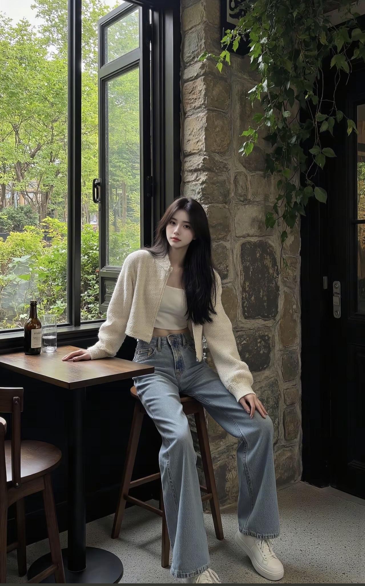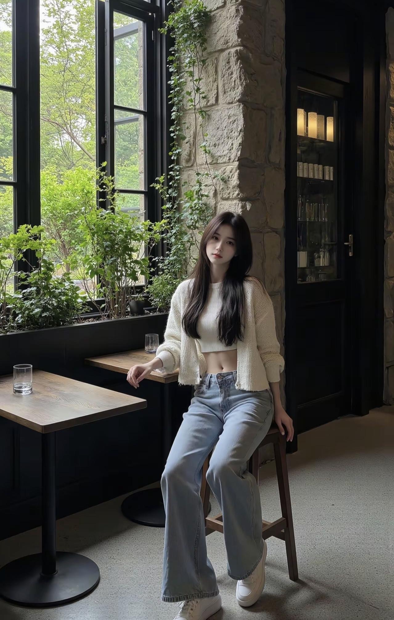 窗边的石墙和绿意撞了个满怀,软乎乎的针织衫裹着松弛感,牛仔阔腿裤把风都揉进裤脚里