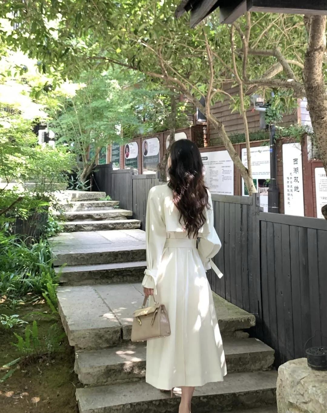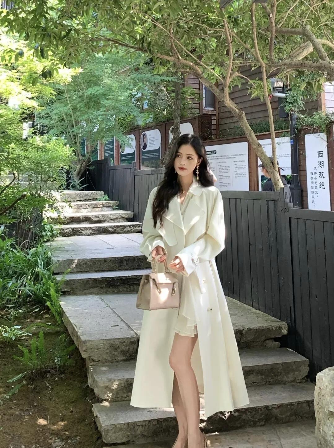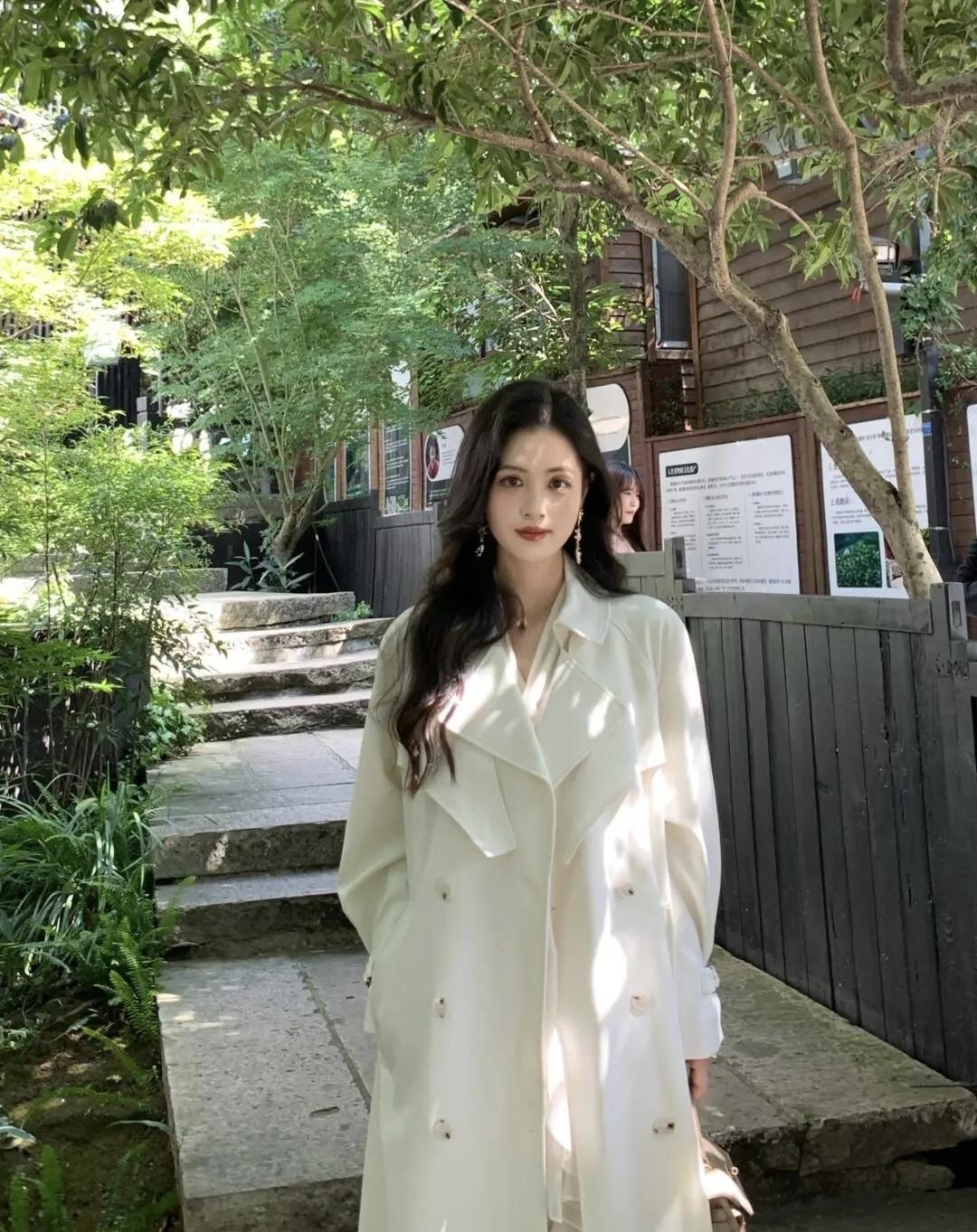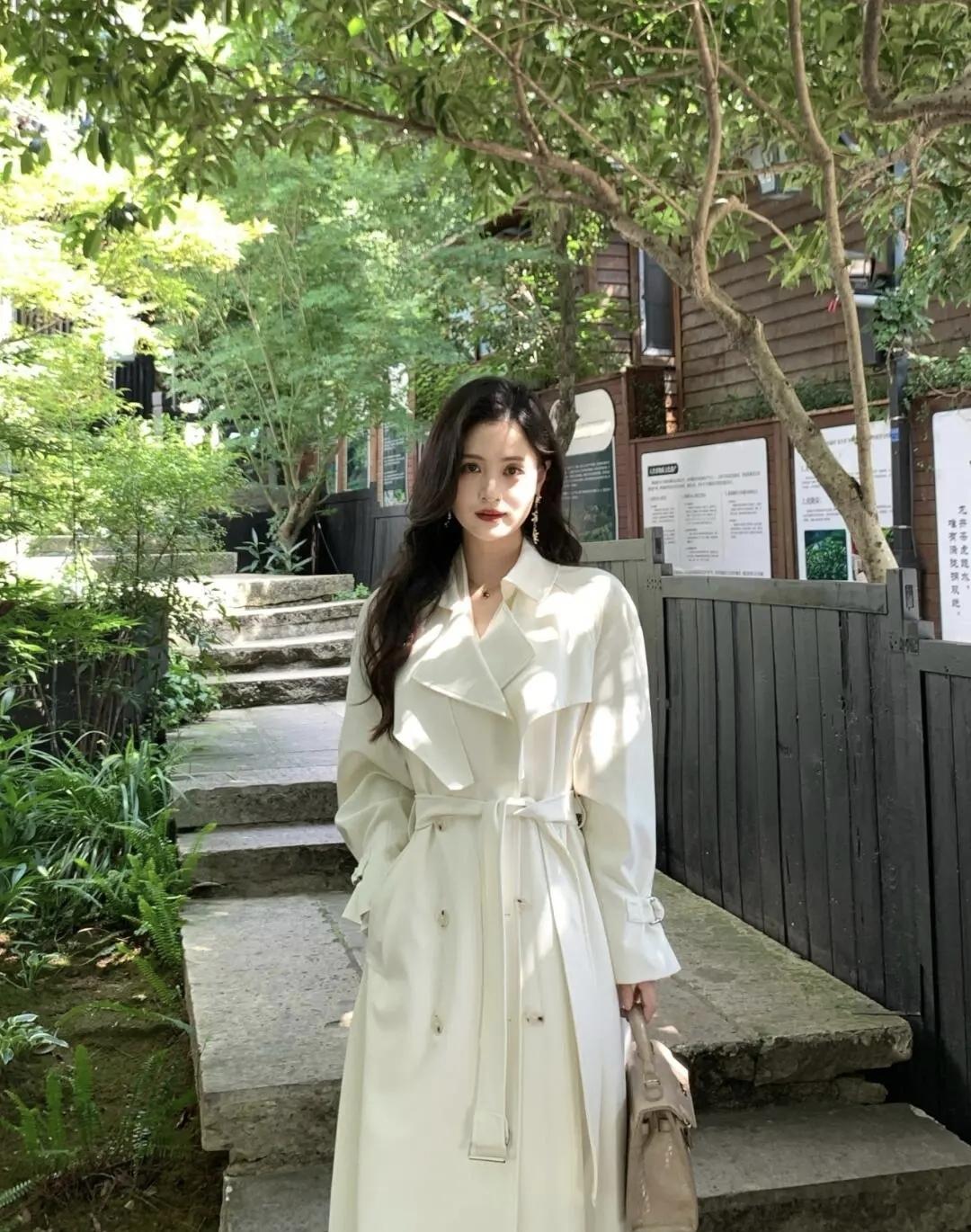 林间光影刚好落在米白色风衣的褶皱里,连风都慢了半拍。