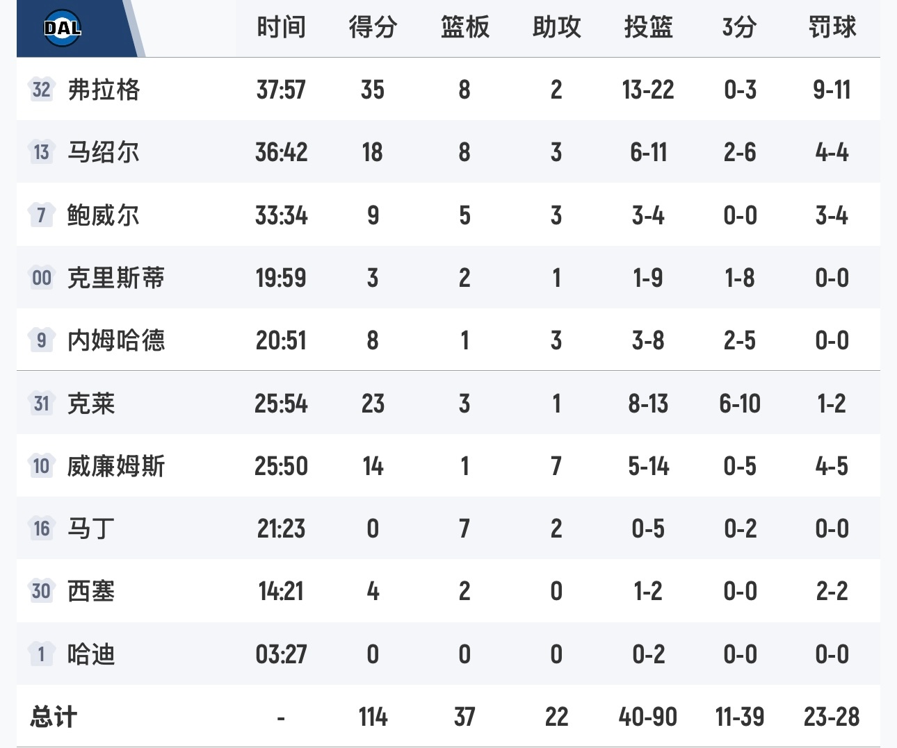 快船110-114输给背靠背作战的独行侠,遭遇四连败排名西部倒数第二。状元弗拉格砍下生涯新高35分,克莱汤普森第四节独得17分。