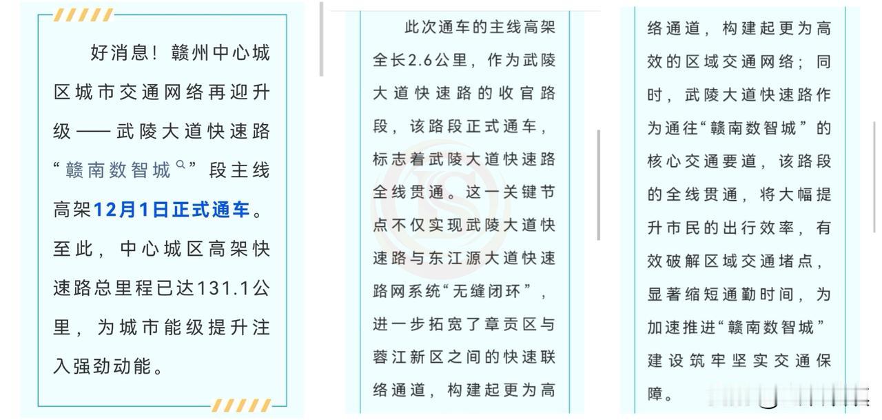 特大好消息!中心城区城市交通网络再迎升级,这条高架于12月1日(明天)正式通车。至此,中心城区的高架快速路总里程已达130多公里,为城市能级提升注入强劲动能。 这条赣州市章贡区武陵大道高架快速路作为通往赣南数智城的核心交通要道,该路段的全线贯通,将大幅度提升赣州市民的出行效率,有效破解区域间的交通堵点,显著缩短通勤时间,为加速推进赣南数智城建设筑牢坚实交通保障。 (祥见下图)