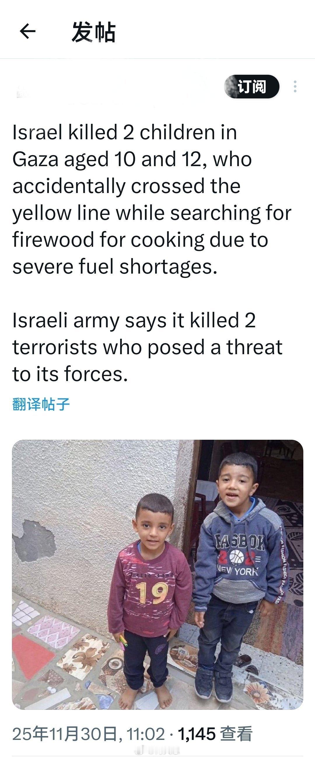 由于燃料严重短缺,两名分别为10岁和12岁的加沙儿童在寻找做饭用的柴火时,不慎越过“停火”黄线,被以色列国防军杀害。以色列军方称,他们击毙了两名对以色列军队构成威胁的恐怖分子。海外新鲜事何天恩