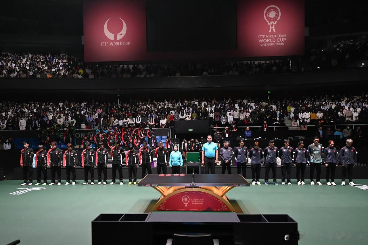成都混团中国队和香港队入场,为香港火灾罹难者默哀一分钟。 中国队入场,看到莎莎和楚钦红色队伍出现的那一刻, 还是很激动的, 好久没看到他们的比赛,虽然说怕他们兼项太累,嘴上说不要打混双, 但是还是很期待看到他们的混双比赛的。 看到他们真正站在赛场上的时候,又非常激动。 在2025年成都混合团体世界杯揭幕战球员入场后, 全场起立为中国香港大埔宏福苑火灾罹难者默哀一分钟。 其实心情很沉重,最不想看到听到的就是这样的消息。 愿逝者安息🙏