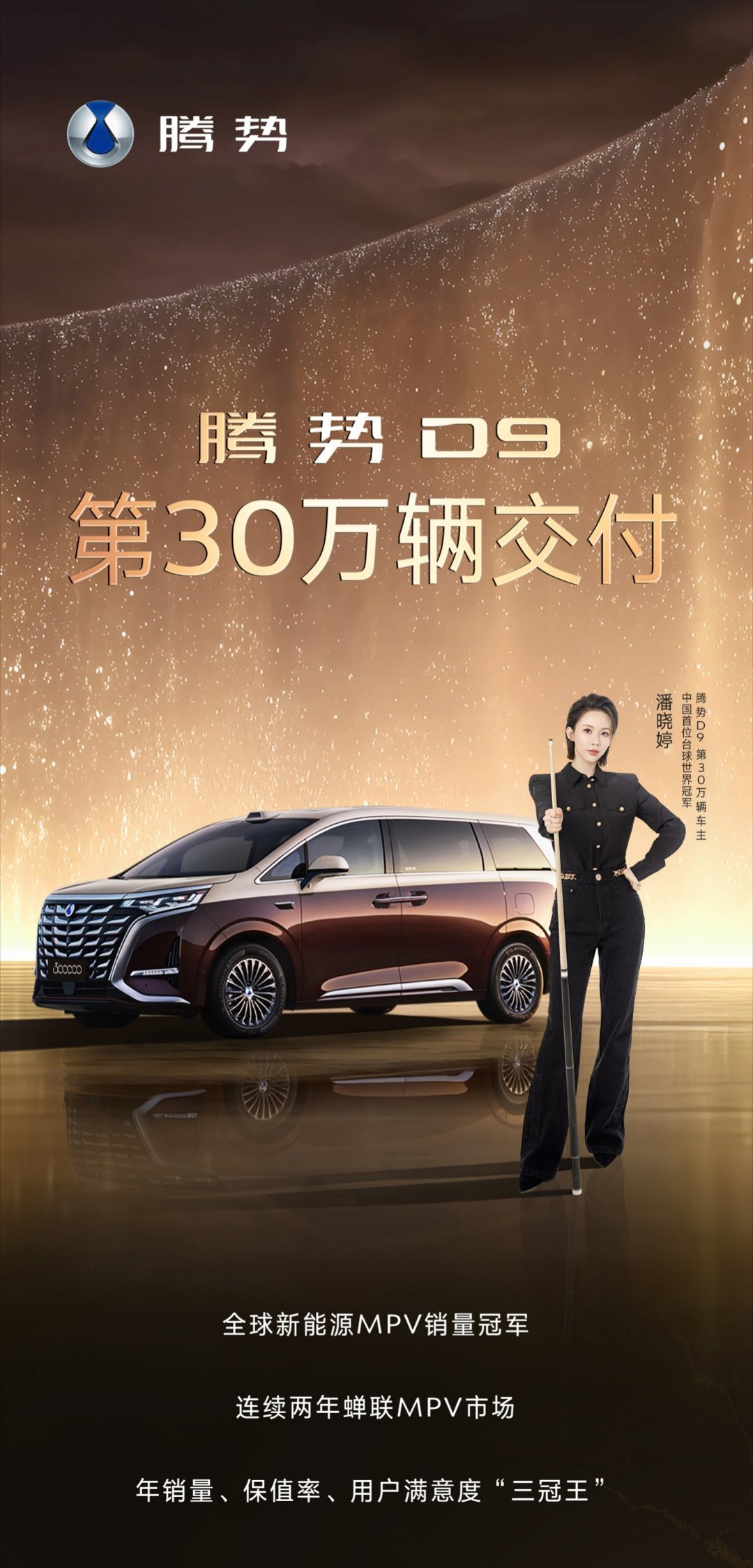 【比亚迪腾势 D9 成全球首款 30 万辆交付新能源 MPV,“九球天后”潘晓婷当上车主】比亚迪腾势 D9 正式达成第 30 万辆交付里程碑,“九球天后”潘晓婷成为腾势 D9 第 30 万辆车主。官方表示,腾势 D9 也成为了全球首个最快完成 30 万辆交付的新能源 MPV 车型。从官方获悉,腾势 D9 于 2022 年 5 月开启预售,同年 8 月正式上市,10 月首辆量产车下线。2023 年 9 月,腾势 D9 最快达成 10 万量产中国豪华车。今年 8 月,腾势 D9 全球销量破 25 万,蝉联 2025 半年度中国市场 MPV 销量冠军。现款腾势 D9 于去年 12 月在国内上市,包括 DM-i 超级混动版和纯电版共 8 个版本车型,官方指导价 33.98~46.98 万元,其中 EV 纯电版 34.98 万元起。