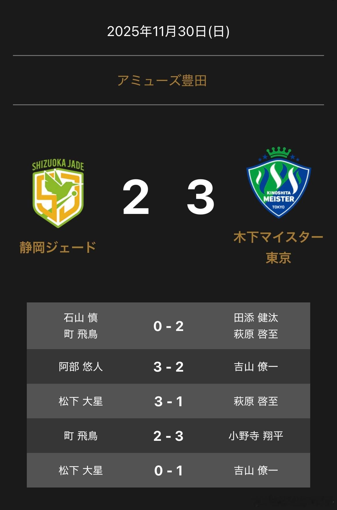 T联赛 11.30 静冈主场2比3木下东京石山慎/町飞鸟 0 - 2 田添健汰/萩原啓至阿部悠人 3 - 2 吉山僚一松下大星 3 - 1 萩原啓至町飞鸟 2 - 3 小野寺翔平松下大星 0 - 1 吉山僚一