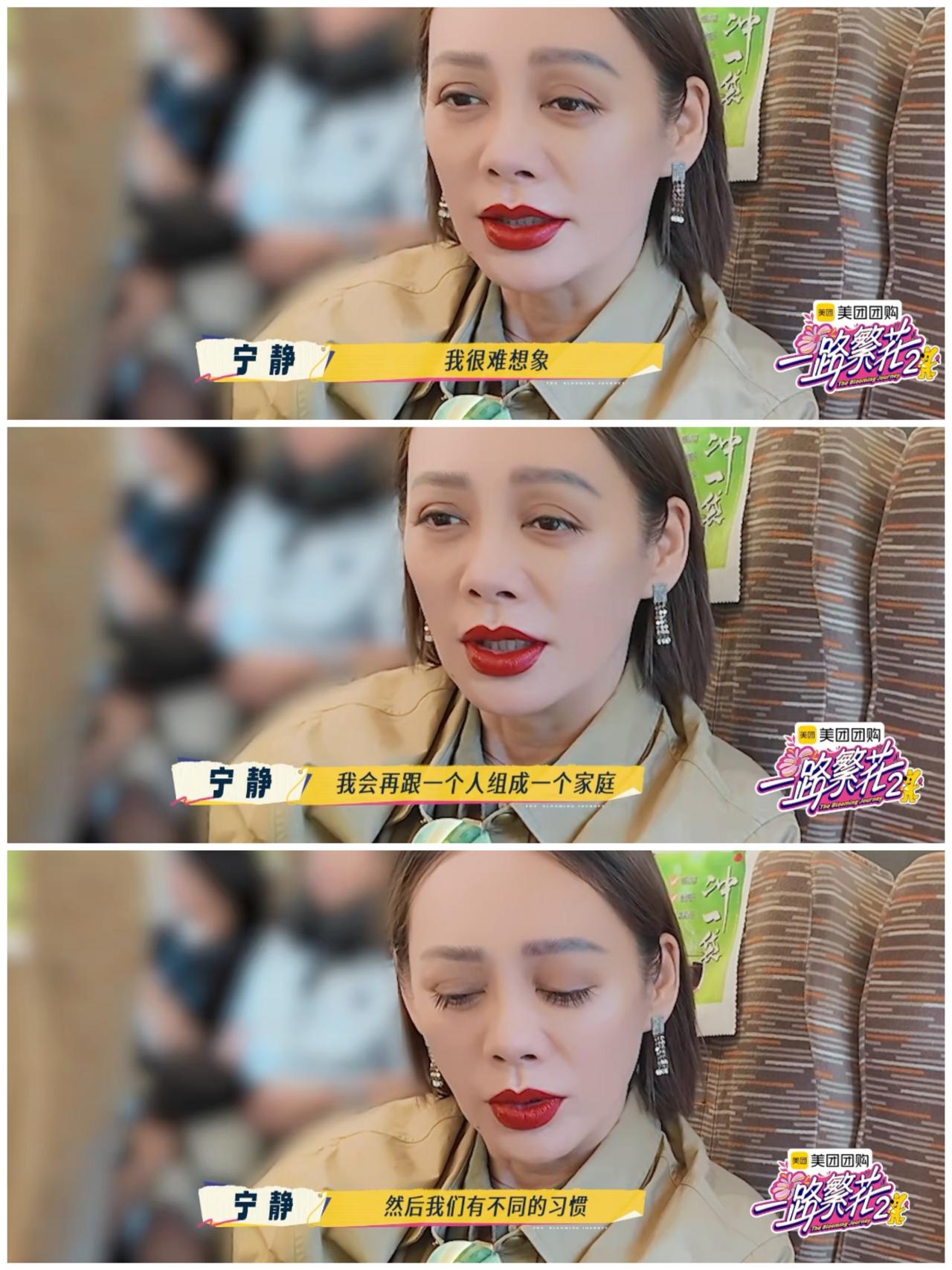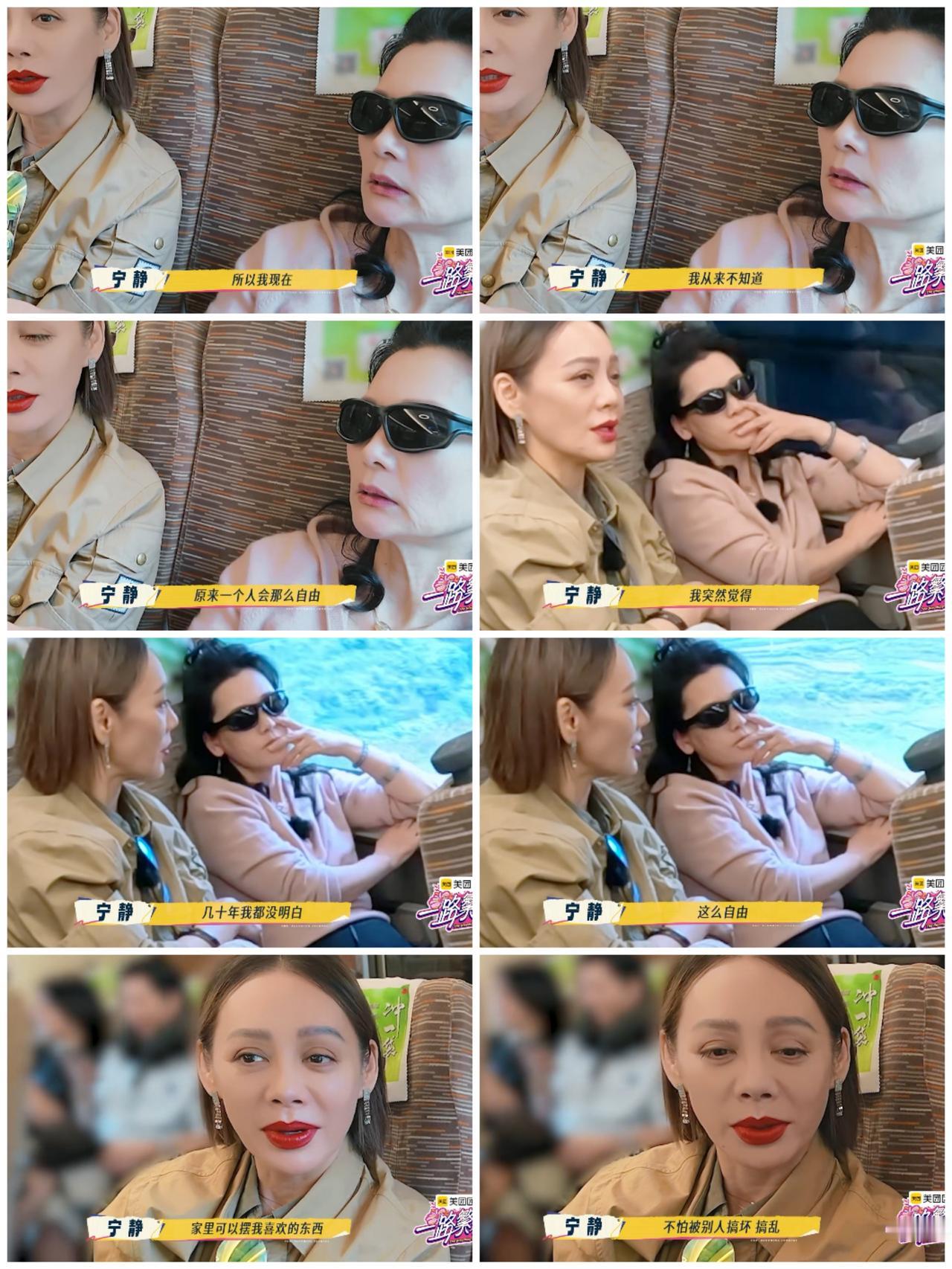 宁静,何赛飞车上闲聊, 聊到她的感情状态, 一股脑都“倒出来”。 宁静告诉何赛飞 自己“大事都办完了” 剩下的时间 就是去“旅游,养花,吃东西,享福”。 宁静觉得50岁后, 照顾好自己, 不给孩子添麻烦 就是对孩子最大的帮助了。 宁静觉得当下的孩子 工作赚钱真的太难了, 比她们那个年代难多了。 宁静当下孩子大了, 就享受一个人的生活, 不想再婚了。 理由是一个人真是很自由, 那是用几十年来明白的道理, 家里可以摆自己喜欢的东西 不怕别人搞坏,搞乱。 对呀, 宁静有钱有颜, 不会再找一个人来跟自己添乱, 孩子也大了, 自己爱干什么就干什么, 真的是人间清醒。 而董璇却同样有钱有颜, 却找了个全网都看不上的“张维伊”。 网友都看不到这个姐的选择。 宁静爱自由, 董璇爱陪伴, 她们都有各自的选择, 她们享受当下的状态就好, 外人无法窥探她们的真实感受。