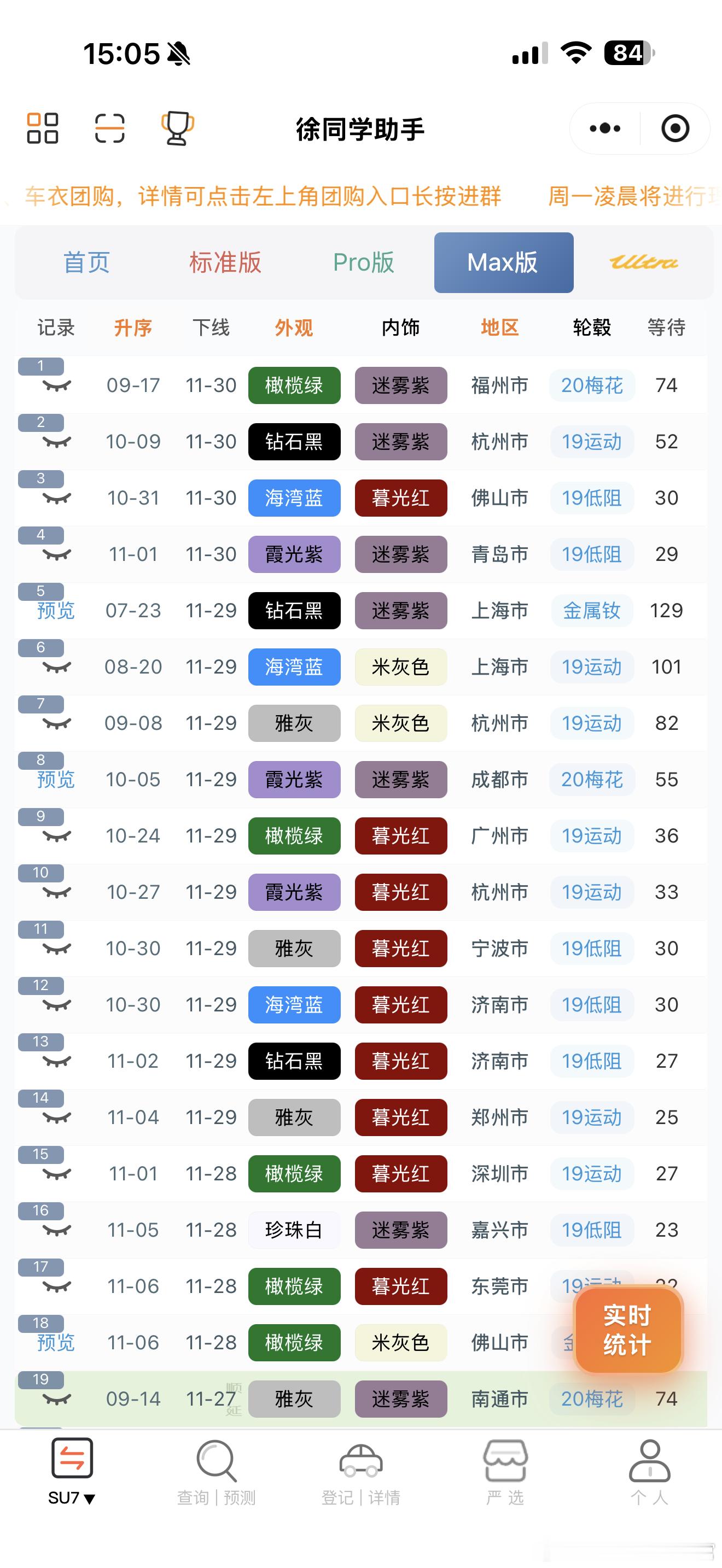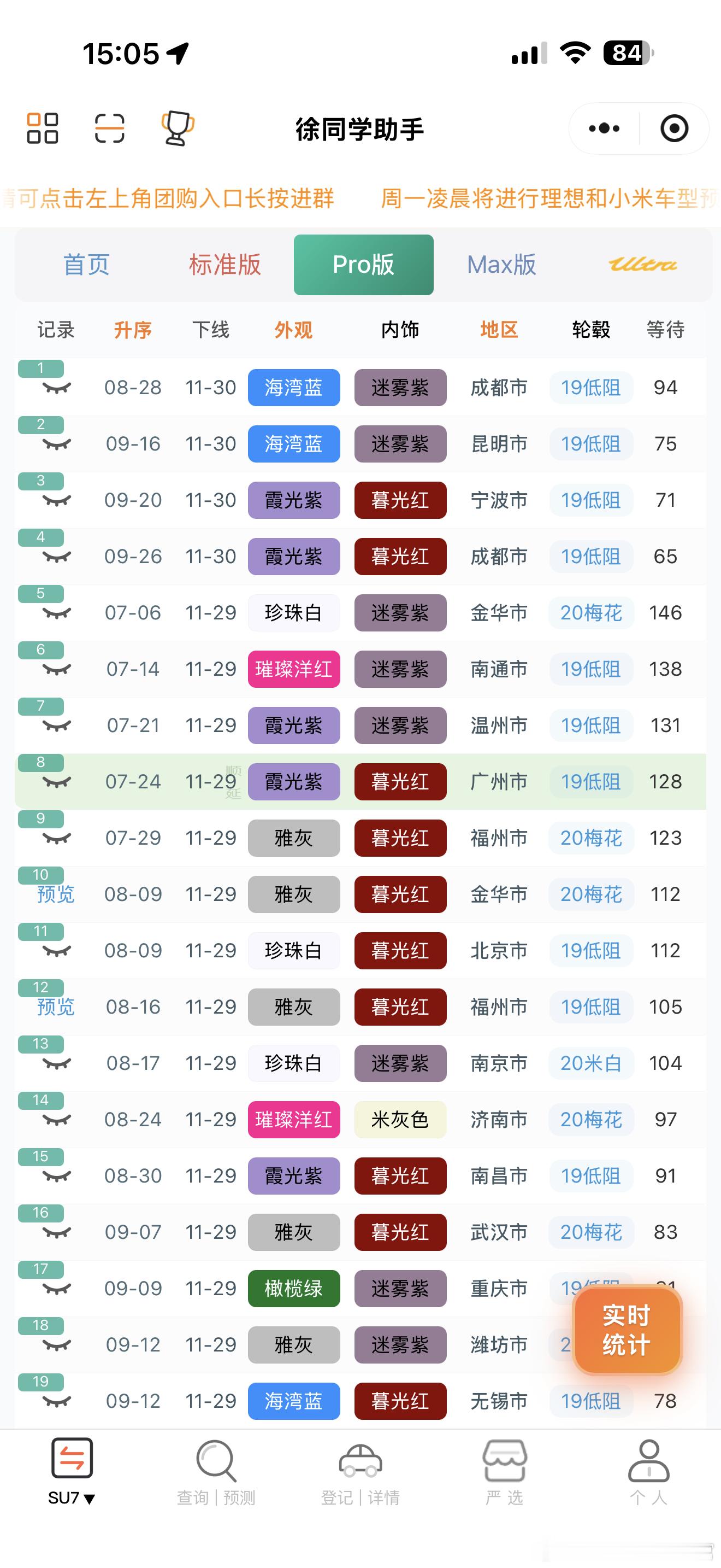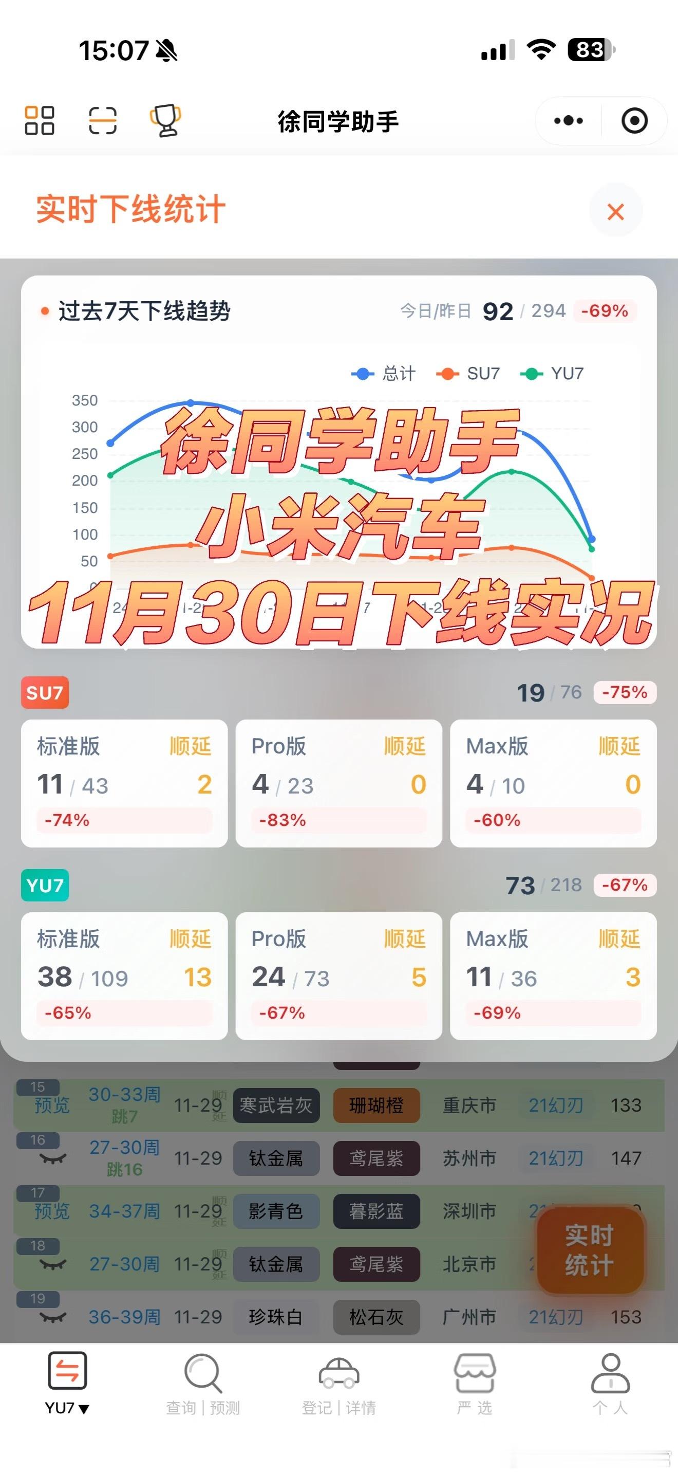 小米汽车(11月30日)下线实况❤️最新样本:排名四万今年可以提车‼️今天是所有品牌购置税兜底的最后一天!!‼️想换配置重新下定的可以抓紧了,或者现在下单一台等到改配新款也可以兜底购置税?(应该不行,毕竟不是小米的原因)📈今天之后基本就很难有新增订单了,所以新款以及改款也临近发布了,后面动作会比较多,好消息也挺多的,大家可以期待一下~🌀YU7(据不完全统计)合计218台1️⃣标准:下线109台,26周左右的和30周以后的都在下线,现在就算是顺延下线的也是下个月提车2️⃣Pro:下线73台,大多数下的都是30周以后的,26号以后的以及7月的也在下线了3️⃣Max:下线36台,发布会当天的基本要结束了,大多数都到7月了,还有当天没下的吗?🌀SU7(据不完全统计)合计76台1️⃣标准:下线43,6月下旬的正在下线,部分下线7月以后的,也有较快顺延2️⃣Pro:下线23,7-8月的随时下线,稀有色不少,整体订单进度越来越快了3️⃣Max:下线10,车很少了,随订随下4️⃣ultra:无更多关于小米汽车的最新资讯和深度解析,请参考【米车派】~徐同学助手小米汽车
