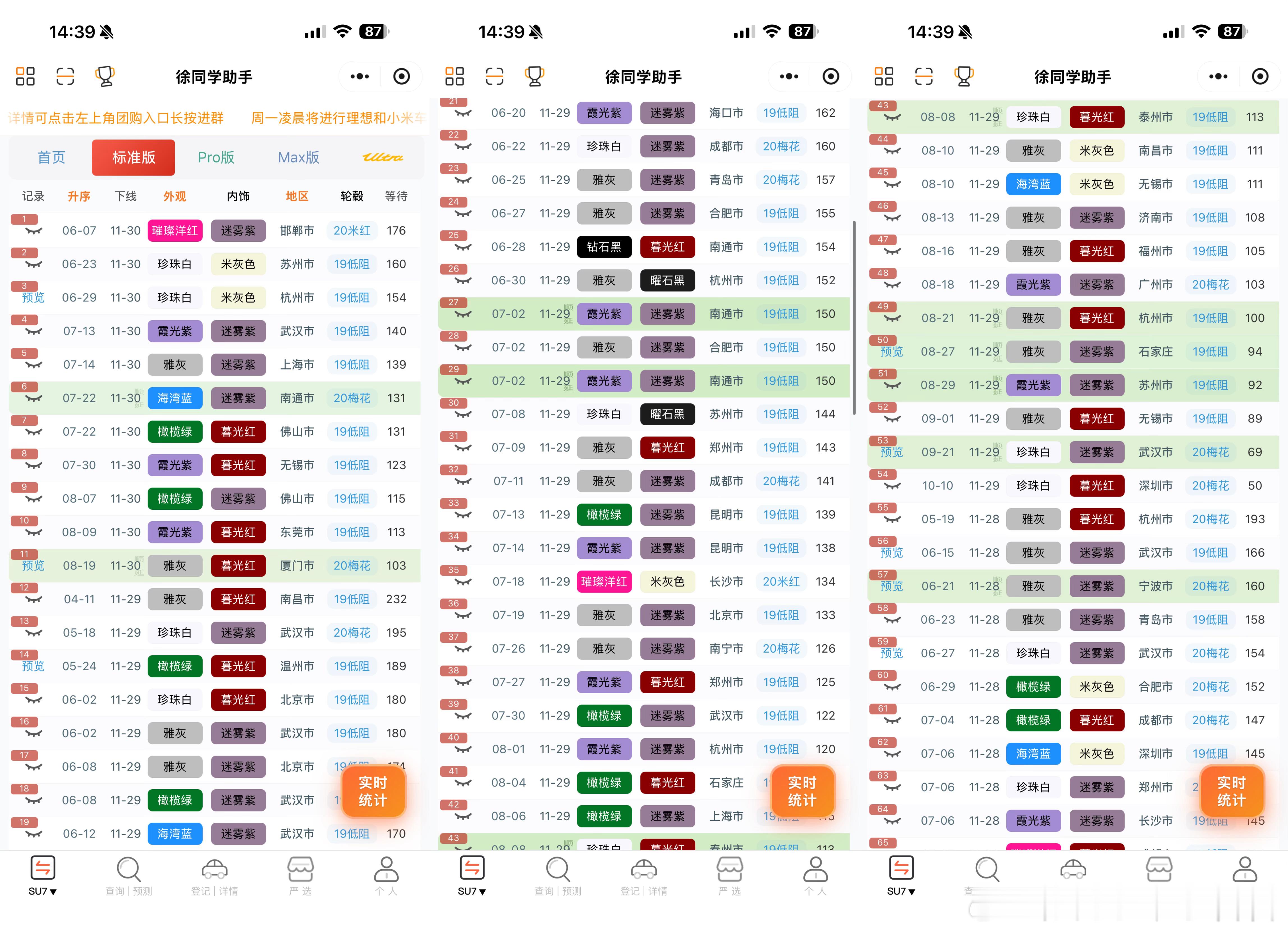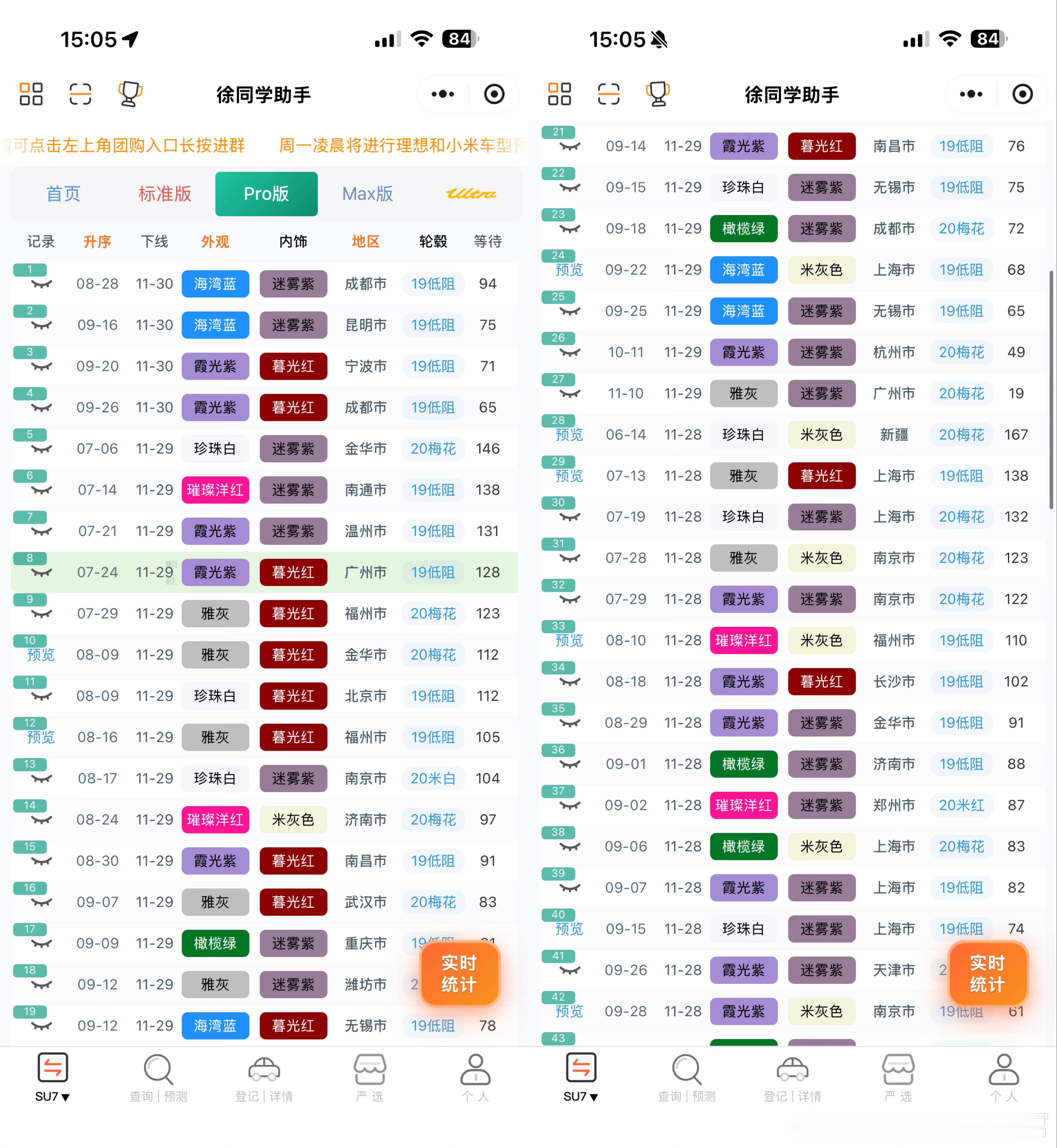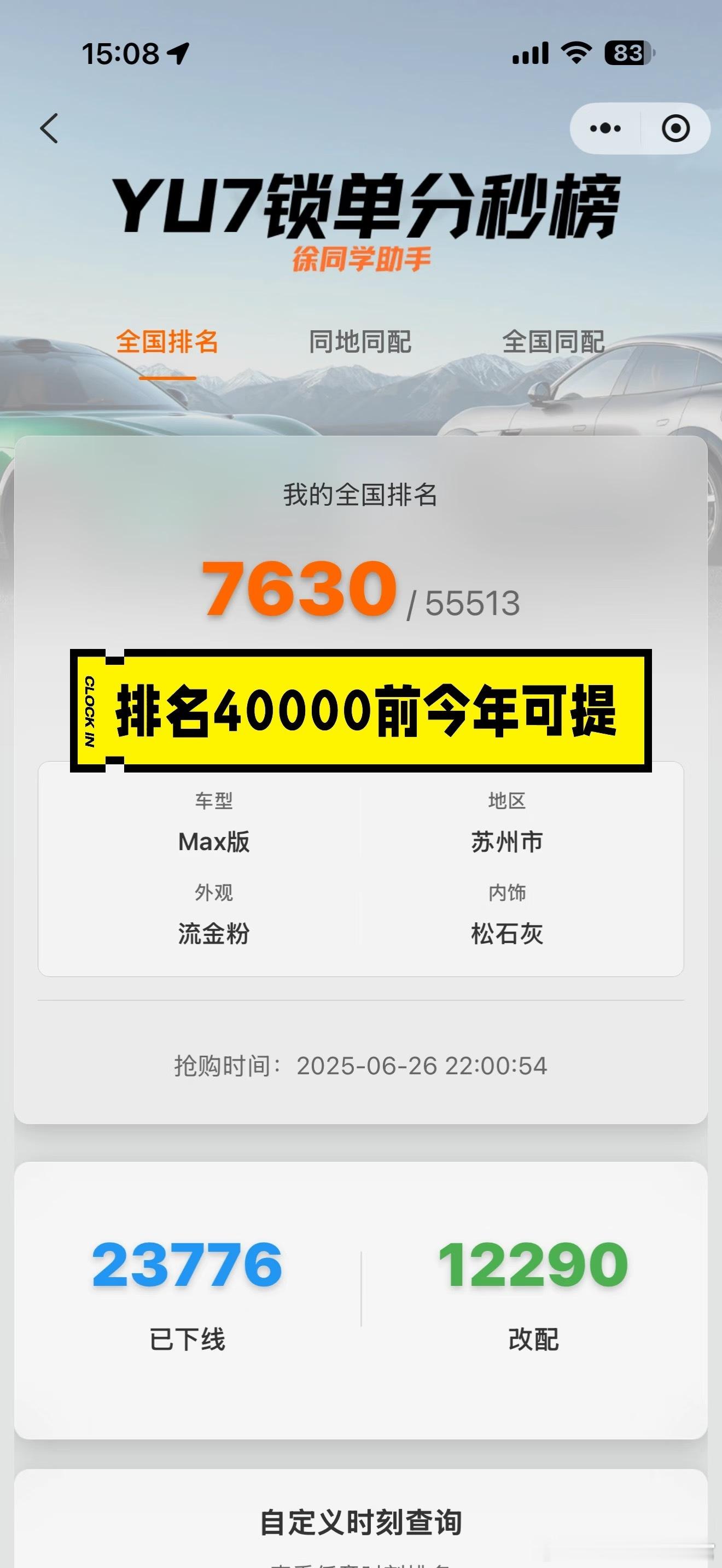 小米汽车(11月30日)下线实况❤️最新样本:排名四万今年可以提车‼️今天是所有品牌购置税兜底的最后一天!!‼️想换配置重新下定的可以抓紧了,或者现在下单一台等到改配新款也可以兜底购置税?(应该不行,毕竟不是小米的原因)📈今天之后基本就很难有新增订单了,所以新款以及改款也临近发布了,后面动作会比较多,好消息也挺多的,大家可以期待一下~🌀YU7(据不完全统计)合计218台1️⃣标准:下线109台,26周左右的和30周以后的都在下线,现在就算是顺延下线的也是下个月提车2️⃣Pro:下线73台,大多数下的都是30周以后的,26号以后的以及7月的也在下线了3️⃣Max:下线36台,发布会当天的基本要结束了,大多数都到7月了,还有当天没下的吗?🌀SU7(据不完全统计)合计76台1️⃣标准:下线43,6月下旬的正在下线,部分下线7月以后的,也有较快顺延2️⃣Pro:下线23,7-8月的随时下线,稀有色不少,整体订单进度越来越快了3️⃣Max:下线10,车很少了,随订随下4️⃣ultra:无更多关于小米汽车的最新资讯和深度解析,请参考【米车派】~徐同学助手小米汽车