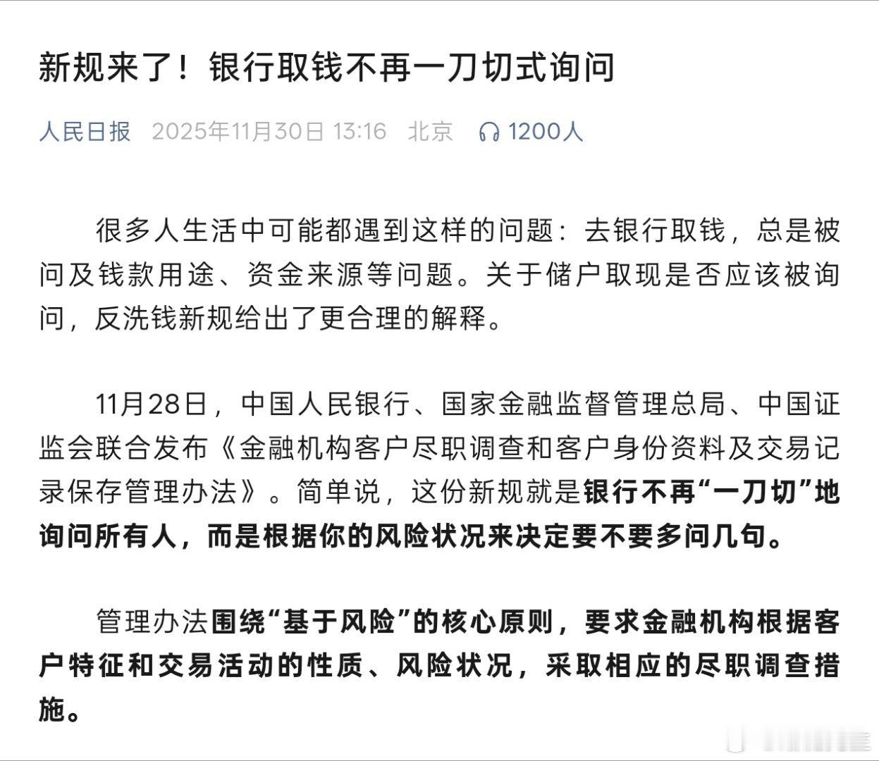 针对去银行取钱,总是被问及钱款用途、资金来源等问题,有关部门联合发文:银行取钱不再一刀切式询问。