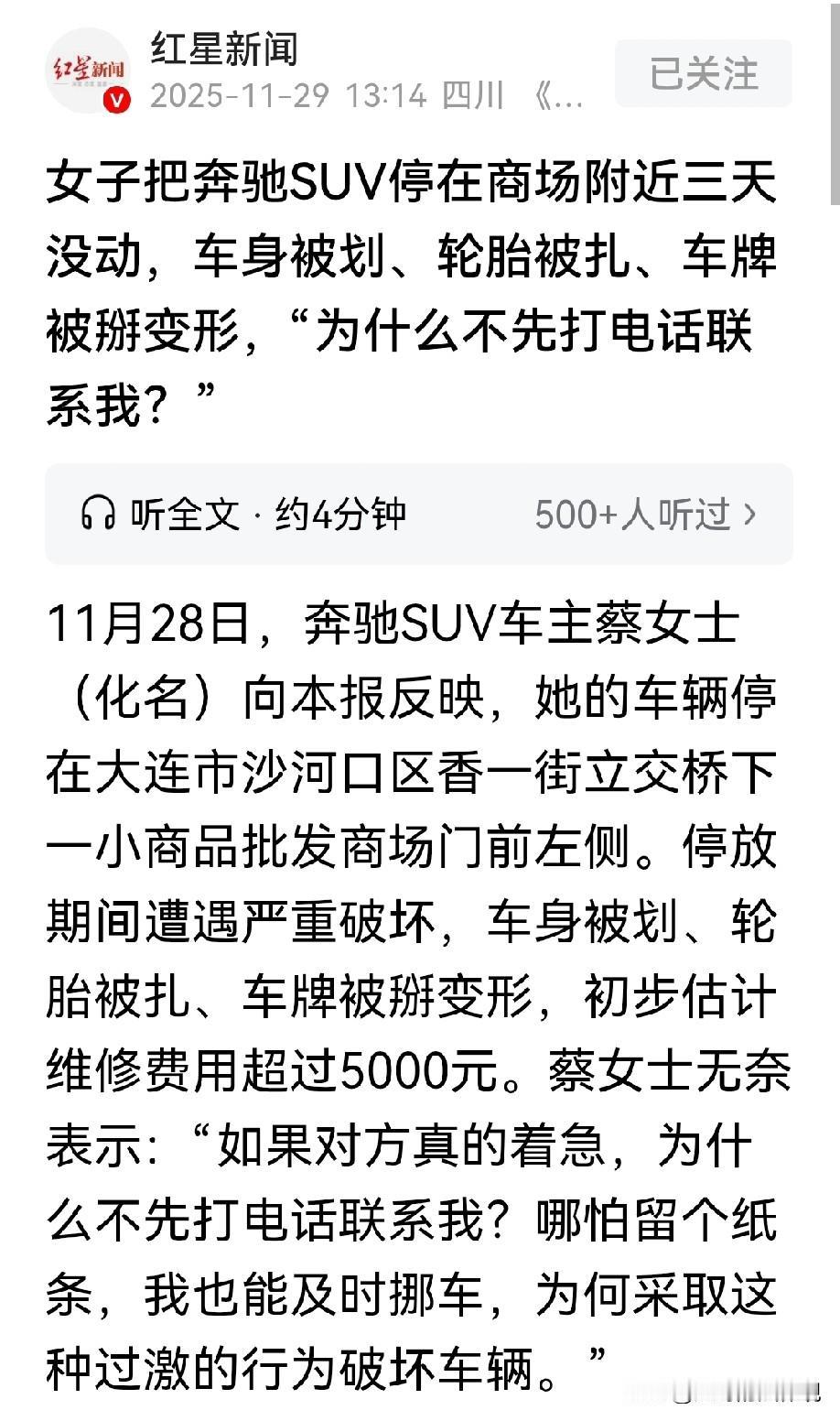 辽宁大连,女子将自己的奔驰SUV车停在某商场门前,两天后,接到交警电话要求挪车,女子说她身体不好没去挪车。3天后,女子去开车,眼前的一幕令她愤怒不已,车子不知被谁糟蹋的不成样子,车牌被掰变形,2米多长的划痕深见底漆,从车头划到车尾,轮胎被扎入四棱三角钉。女子差点崩溃:如果碍事,弄个拖车拖走都行。女子报警,要求追究到底!视频发布后,没想到,评论区网友一边倒,指责车主无理取闹。 蔡女士有一辆奔驰suv,但她却一直没有自己的停车位。 平时都停放在某立交桥下,一家小商品批发市场门前左侧,但从没出过事儿。 可仅仅因为她前一段时间身体不好,车子停在那里,时间长了点。 可等她再去开车时,痛心的发现,车子已经被损毁的不成样子了! 11月11日当晚8点左右,蔡女士和往常一样,仍然把车停在了商场门前。 她这次停的时间比较长,怕影响到商家,停车时确认没有挡住商场的入口。 而且,她在前挡风玻璃上留下了联系电话。 她以为,如果车子真碍了谁的事儿,肯定会打电话联系到她。 果不出所料,就在一天后,蔡女士突然收到交警的电话,称有商家要求她将车挪走。 可不巧的是,当时蔡女士因身体原因,并没有去挪车,而是和交警沟通了几句。 蔡女士表示,停车期间,她除了接到交警的一个挪车电话之外,没在接到过任何要求挪车的通知。 她安心在家调养身体,直到痊愈后她才去开车,而此时距离她停车已经过了3天。 11月14日一大早,蔡女士来到停车的地方准备开车,可眼前的一幕,让她瞬间崩溃! 她的那辆爱车,已经被破坏的不成样子! 她一眼就瞅见,后车牌已经被人朝上掀起,掰成60度角变了形,翘在那里特别扎眼。 她赶紧上前仔细查看,结果气的浑身发抖,差点哭出来。 只见车身右侧从车头到车尾,被人用利器划出两条2米多长的划痕,有的地方已深见底漆。 蔡女士心疼的眼泪差点掉下来,这是什么人对车有这么大的仇恨? 自己到底得罪了谁,竟然如此心狠手辣,把车毁到这种程度! 这辆车是蔡女士的心爱之物,平时哪怕有点儿小剐蹭都心疼半天。 蔡女士不放心,对车子再次仔细检查,果然在启动时,发现仪表盘显示气压异常。 她顾不得追究损毁车子的人是谁,赶紧把车送到汽修厂去检查。 她担心车子还有其他安全隐患,万一上路别再出啥危险。 果然,维修人员在右后轮胎,拔出一枚四棱三角钉,这也证实了这是人为破坏。 经维修人员检查后估算,把车子修好,可能超过5000元的费用。 蔡女士对车辆被损坏成这样很是愤怒,但也很不理解。 自己车上留了挪车电话,如果车子真的妨碍了谁,为啥不打电话联系自己? 对方这么做的目的,明显是报复行为。 蔡女士认为,这次停车的时间确实有点儿长,可能给他人带来了不便。 如果车子真挡了路,哪怕叫拖车把车拖走,自己都能接受。 车子破坏成这样,蔡女士无论如何都忍不下这口气, 不但经济上造成了损失,还有可能会影响到车子的二手价值。 因无法确认破坏车辆的人到底是谁,蔡女士选择了报警,要求追究到底,绝不手软。 她希望搞破坏的人受到处罚的同时,应对自己遭受的损失进行赔偿。 对于车主的如此遭遇,很多网友并不同情。 其实人们一眼就能看出,蔡女士的车辆被人为损坏,这里面肯定有隐情。 虽然对方的行为过激,但主要问题,还是车主把车停在商场门前好几天不挪车。 本来实体店的生意就不好做,再让车这么一挡,生意还咋做? 再说,如果车主好说话,估计商家也不会让交警联系她。 身体不舒服不是有错在先的理由,实在不行叫代驾帮忙。 车主要求赔偿损失,商家的损失由谁来赔? 那么以法律的角度,如何看待人为损毁车辆的行为? 《刑法》第275条:故意毁坏公私财物,数额较大或者有其他严重情节的,处3年以下有期徒刑、拘役或者罚金; 数额巨大或者有其他特别严重情节的,处3年以上7年以下有期徒刑。 破坏者故意掰弯车牌、划伤车身、扎破轮胎,导致车辆维修费用超5000元,符合故意毁坏财物罪的构成要件。 破坏者通过极端手段报复,如使用三角钉扎胎、车身深划痕,体现明显主观故意,可能被追究刑事责任。 即使车辆停放不当,也不能通过破坏他人财物,来解决问题。 恶意损毁他人车辆,达到一定金额即构成犯罪,需承担刑事责任和民事赔偿,网友指责车主不代表破坏行为合法。 《道路交通安全法》第90条 :机动车驾驶人违反道路交通安全法律、法规关于道路通行规定的,处警告或者20元以上200元以下罚款。 若蔡女士停车区域属于禁止停车路段,其行为可能违反道交法,需承担行政处罚。 即使蔡女士停车不当,破坏者仍需为故意损毁车辆的行为负责。 但蔡女士的过错,可能在民事赔偿中减轻对方责任。 无论停车是否合理,故意毁坏财物均违法,需赔偿损失,甚至面临刑事处罚。 对此你怎么看?