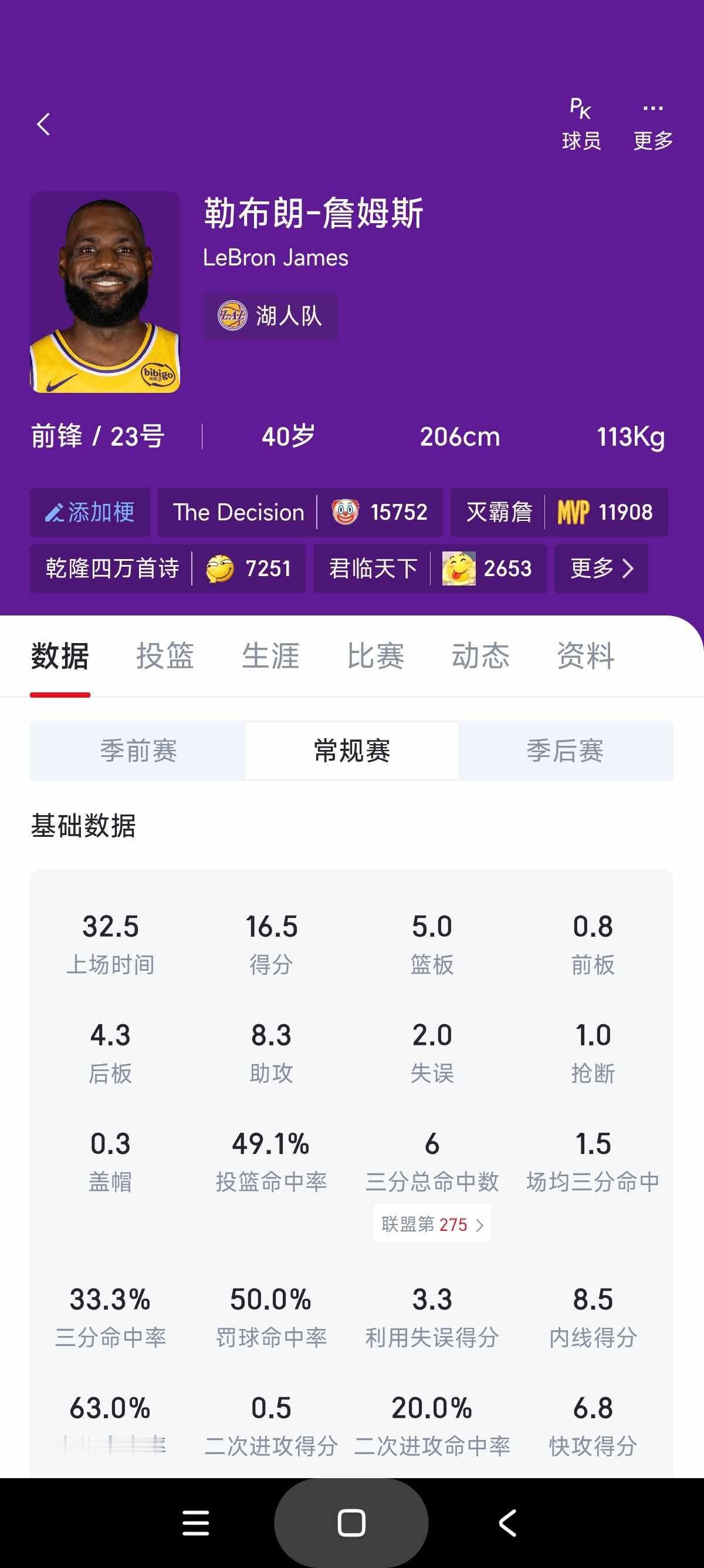 詹姆斯得分跌了,助攻涨了,球队反而更稳了 这赛季詹姆斯的数据让人惊讶,场均得分只有十六分左右,比上个赛季少了将近三分之一,出手次数也从十七次降到十一次,看起来像是退步了,但三分命中率反而稍微提高了一点,这说明他打球更有选择,不是随便出手。 湖人现在不再依赖他一个人单打独斗了,后场搭配了拉塞尔、里夫斯和布朗尼,全队三分出手非常多,在全联盟排名前五,詹姆斯也不再像以前那样每个球都自己处理,而是改打高位策应,增加了跑动,经常接球就传球,偶尔背身虚晃一下对手,比如上个月对阵勇士那场比赛,詹姆斯只出手八次,却送出十二次助攻,这种打法组合在以前是很少见的。 教练组正在调整思路,在休赛期送走拉塞尔换来未来选秀权,这说明球队打算重点培养年轻球员,主教练哈姆直接表示,目标不是限制詹姆斯的上场时间,而是希望他能打得更久一些,数据显示詹姆斯不在场上时球队整体效率反而更高,这意味着球队正尝试减少对詹姆斯的依赖,学习在没有他持球的情况下也能赢球。 联盟的比赛节奏变得更快,三分出手也更多,这种趋势对老将来说不太有利,詹姆斯的快攻得分直接减半,突破的命中率也下降了一些,但他那些高难度的后仰跳投和假动作还是能进球,说明他的能力没有变弱,只是打法选择有了调整。 替补席上的角色被他带动起来,他场均传球创造的机会排在联盟前三,可镜头总是忽略接球的队友,有场对阵太阳的比赛,他通过挡拆吸引三人包夹,助攻中锋完成空接扣篮,但导演组在剪辑时直接删掉了这个片段,大家只关注他得分少了,没人提到他让球队进攻变得更流畅了。 与其他老将相比,科比在三十八岁时依然扛起球队,马龙到四十岁还是进攻核心,詹姆斯四十一岁得分掉到十七分以下,却拿下助攻王,正负值保持为正,出场时间也没有减少,他的能力没有变弱,只是换了一种方式在场上发挥作用,这件事值得仔细体会。詹姆斯