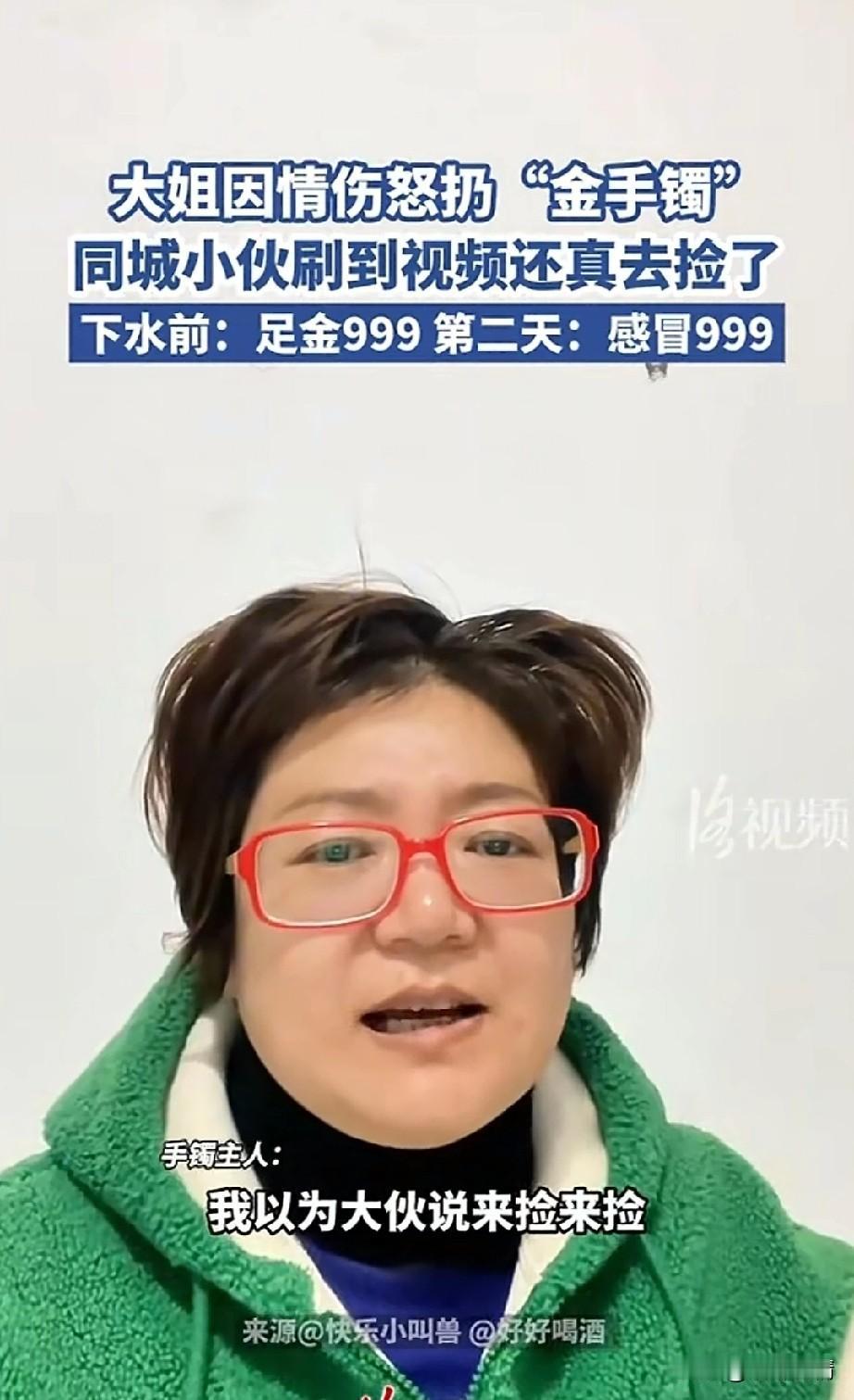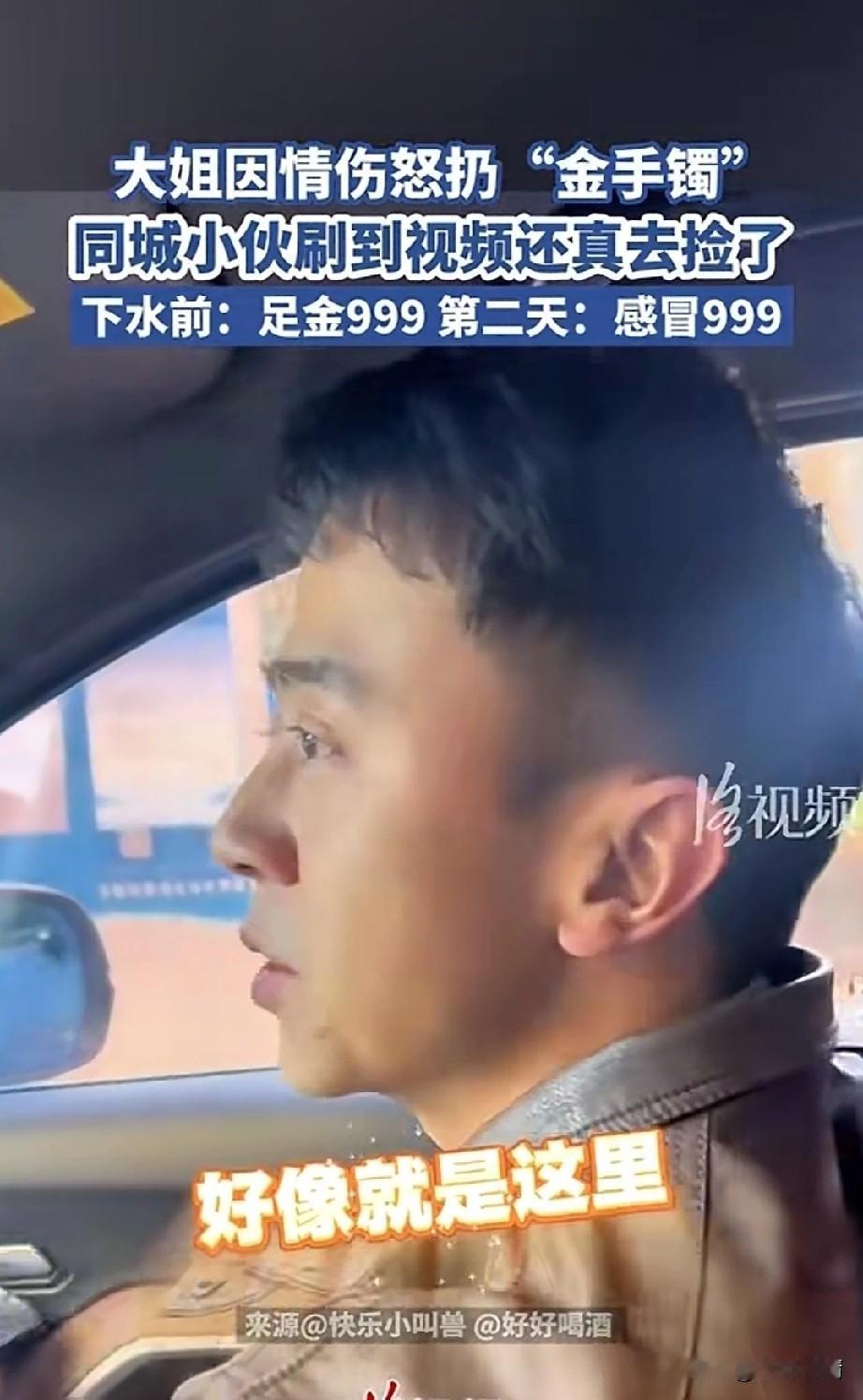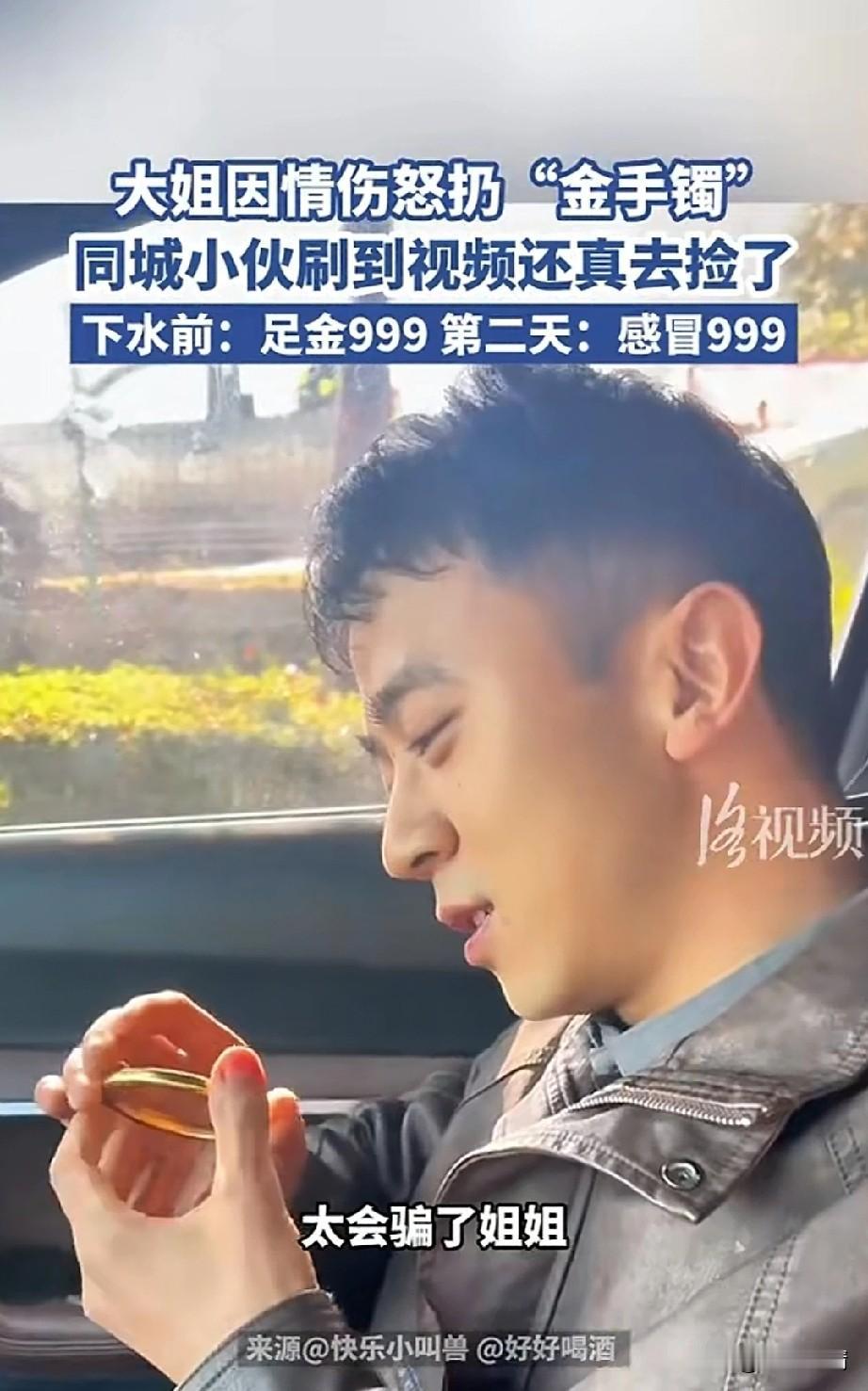 大家因为情伤扔了金手镯, 同城小伙子刚好看到这个视频, 于是打车去到了同样的地方, 发现还真有大姐扔的金手镯, 小伙子也是实诚人, 二话不说就跳进水里, 去把那个金手镯捡了上来, 这么冷的天裤腿湿了大半, 坐在车上看了看金手镯, 这才发现原来是铜的, 这才反应过来, 于是拍了视频抱怨, 结果大姐也刷到了这个视频, 笑的合不拢嘴, 表示自己只是拍个视频, 没想到还真有人去捡这个金手镯, 她对小伙子表达了歉意, 希望小伙子联系她, 她可以过去请小伙子吃饭! 一个敢扔,一个还真敢去捡, 网友表示下水之前足金999, 下水之后感冒999, 大家对于这事怎么看? 昆明爆料感情的那些事 戴金手镯 手镯金 捡金镯子