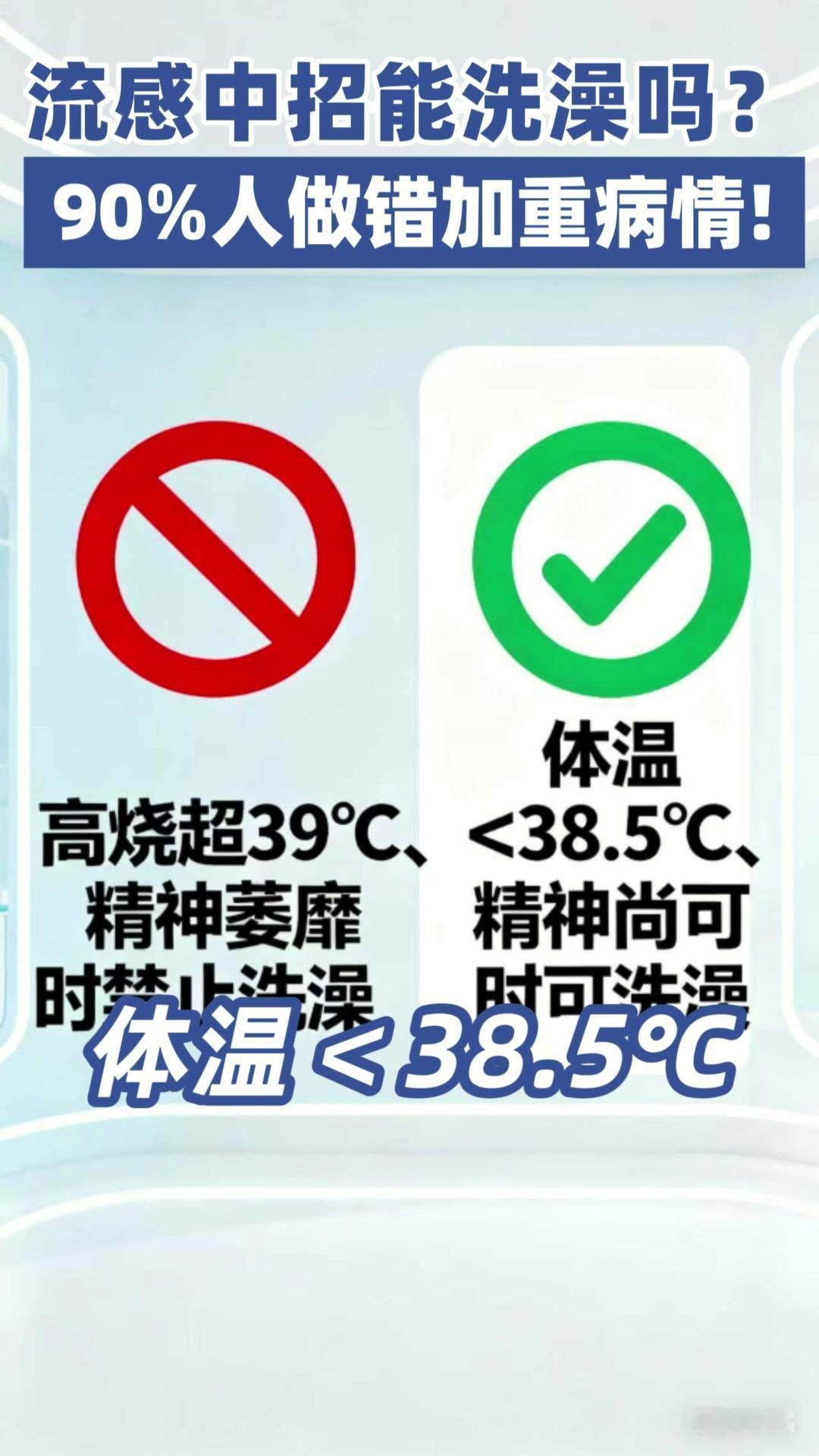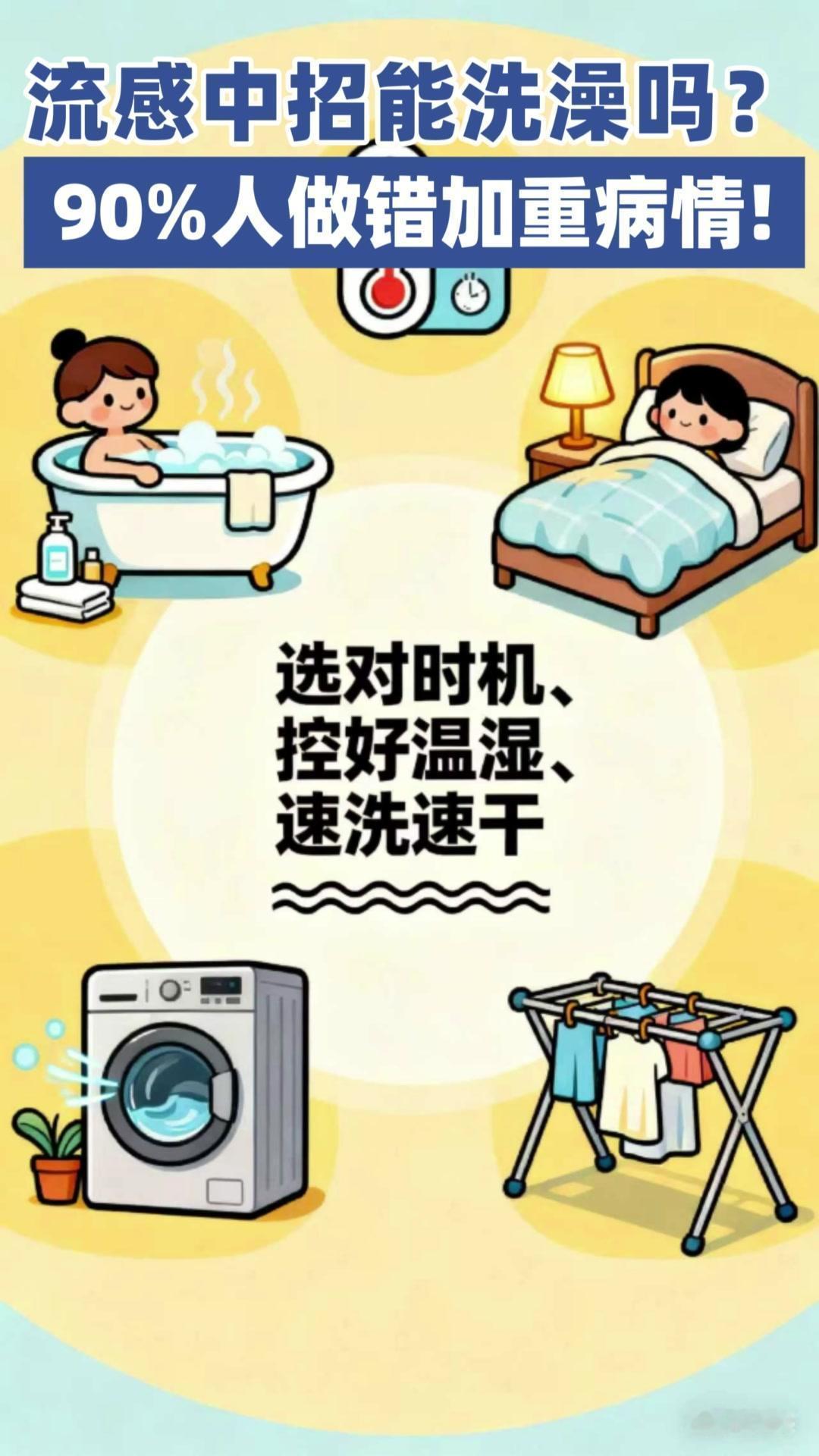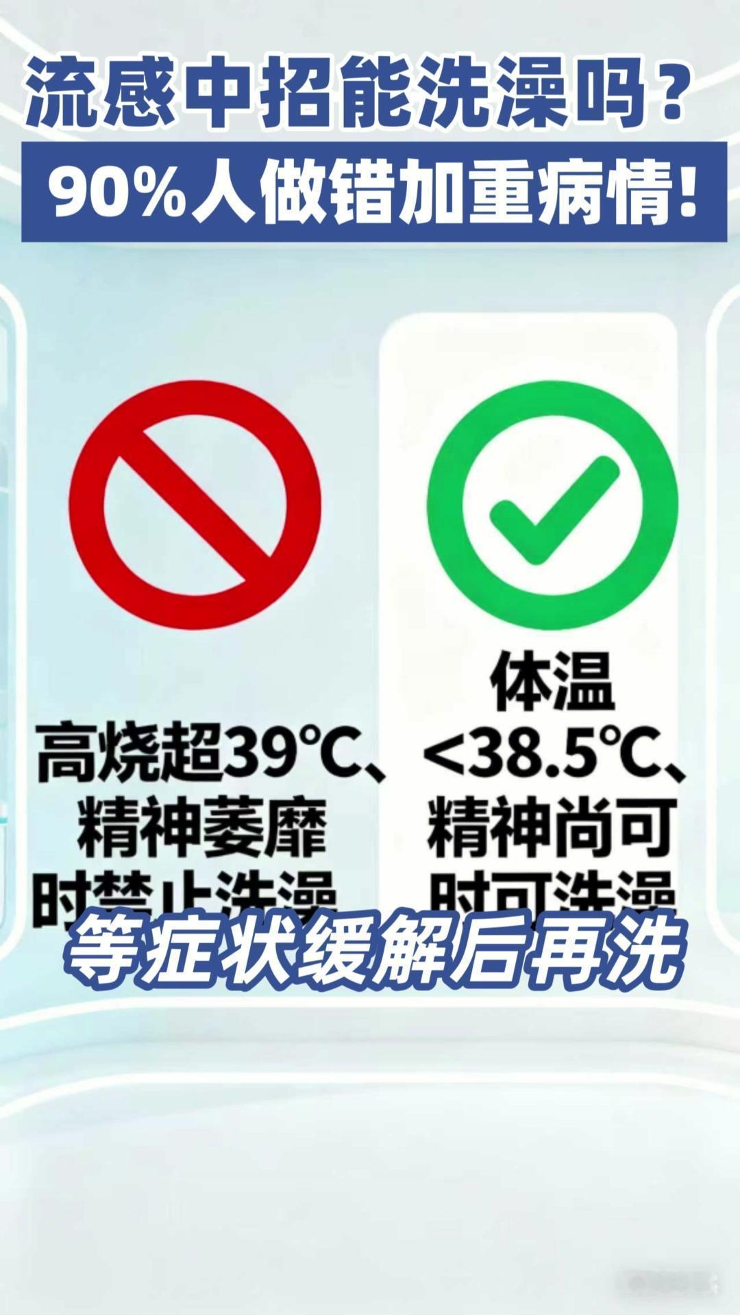 流感高烧浑身酸痛时,想洗个澡却总被家人拦住说会加重病情?其实别信这种谣言!洗澡本身不会让流感加重,关键是找对方法和时机。 先判断是否能洗:体温小于38.5度,精神状态尚可,没有脱水或严重不适,就能洗;反之则要卧床休息,等症状缓解再洗。 准备工作很重要:室温控制在24-26度,关闭门窗,水温调至38-40度,手感温热不烫即可,提前放好热水。 控制好细节和后续护理:洗澡时间不超过10分钟,选淋浴避免盆浴,不用刺激性沐浴露,洗完立即擦干全身,重点吹干头发。穿宽松保暖的衣物,喝杯温水补水,避免马上外出或吹风,休息30分钟再活动。 流感期间不是绝对不能洗澡,选对时机、控制好温度、速洗速干,配合好好休息,才能更快康复。别被误区误导啦!