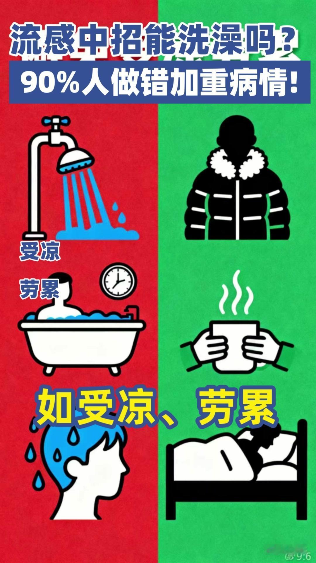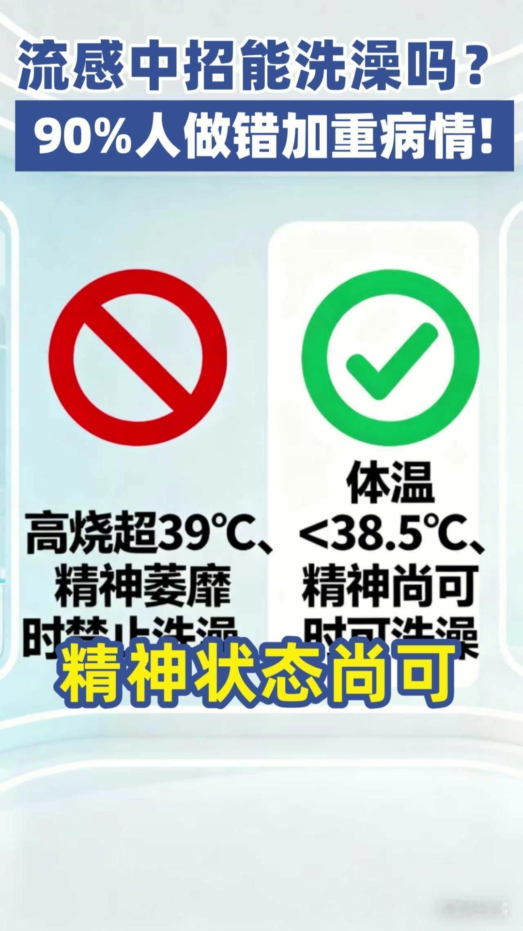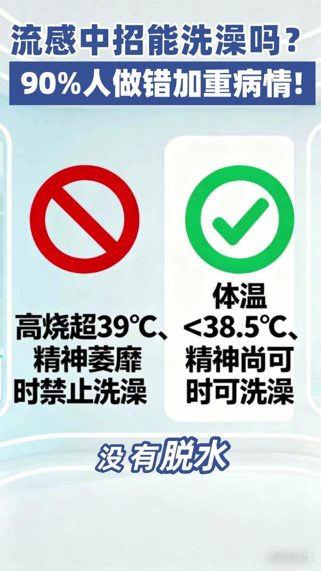 流感高烧浑身酸痛时,想洗个澡却总被家人拦住说会加重病情?其实别信这种谣言!洗澡本身不会让流感加重,关键是找对方法和时机。 先判断是否能洗:体温小于38.5度,精神状态尚可,没有脱水或严重不适,就能洗;反之则要卧床休息,等症状缓解再洗。 准备工作很重要:室温控制在24-26度,关闭门窗,水温调至38-40度,手感温热不烫即可,提前放好热水。 控制好细节和后续护理:洗澡时间不超过10分钟,选淋浴避免盆浴,不用刺激性沐浴露,洗完立即擦干全身,重点吹干头发。穿宽松保暖的衣物,喝杯温水补水,避免马上外出或吹风,休息30分钟再活动。 流感期间不是绝对不能洗澡,选对时机、控制好温度、速洗速干,配合好好休息,才能更快康复。别被误区误导啦!