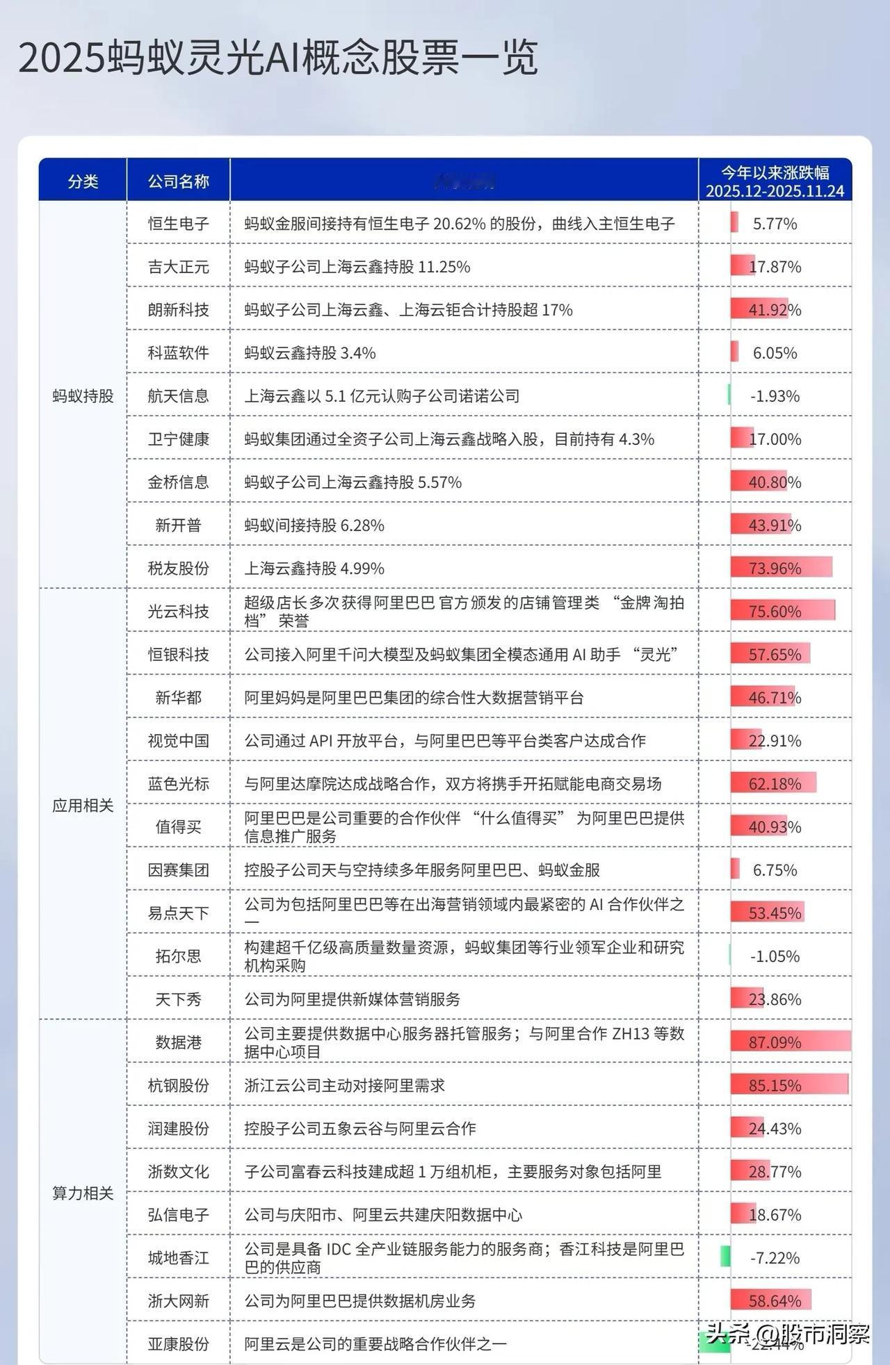 蚂蚁生态与AI概念关联企业市场表现全景扫描 随着人工智能技术浪潮与平台生态的深度融合,与大型科技企业相关联的产业链公司日益受到市场关注。根据近期市场数据,相关企业按业务关联可划分为三大板块,整体呈现出较高的市场热度与显著的分化态势。 在直接投资板块,部分由蚂蚁集团通过子公司持股或战略投资的上市公司表现活跃。这些企业覆盖了金融科技、企业服务、信息化解决方案等多个领域,今年以来多数实现股价上涨,其中个别标的涨幅超过70%,反映出市场对其背后生态资源与协同效应的认可。 在AI及平台应用领域,一批为阿里巴巴及蚂蚁旗下平台提供营销、数据、电商运营与内容服务的公司同样涨势显著。这些企业受益于平台经济与AI技术商业化落地的双重驱动,多只个股涨幅超过50%,显示出市场对AI赋能营销与运营环节的价值重估。 此外,在算力基础设施层面,与阿里云等头部云厂商合作的数据中心、云计算相关企业亦表现突出。作为AI发展的底层支撑,该板块受到长期资源投入与需求扩张的推动,部分企业涨幅超过80%,凸显出市场对算力产业链前景的积极预期。 综合来看,与科技巨头生态紧密相关的AI概念方向当前市场情绪高涨,板块内赚钱效应显著。这种热度既源于对人工智能产业前景的乐观展望,也体现了生态协同带来的业务增量想象空间。未来发展仍将取决于技术迭代进度、企业自身竞争力以及实际业绩的兑现能力。投资者在关注整体趋势的同时,也需留意技术路径、行业政策与市场竞争中潜在的不确定性。 蚂蚁灵光 阿里AI 股票知识 股市点评 股市分析