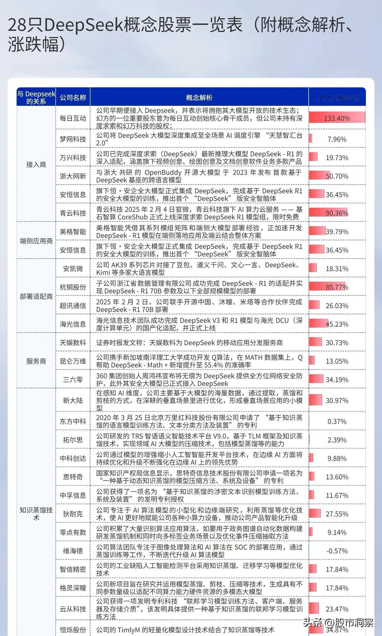 DeepSeek生态合作企业全景解析:AI浪潮下的多元布局与市场前景 随着DeepSeek在人工智能领域的快速崛起,其生态合作伙伴呈现出多元化、多层次的特点。从目前的市场布局来看,相关企业主要分布在四大核心领域,展现出不同的合作深度和市场表现。 在技术接入层面,多家企业通过直接集成DeepSeek大模型或参与其技术生态建设,实现了产品的智能化升级。这些合作涵盖了从内容创作到安全防护等多个应用场景,显示出DeepSeek技术在实际业务中的广泛适用性。 端侧应用领域的企业正致力于将大型模型部署到终端设备,这反映了AI技术从云端向边缘计算延伸的重要趋势。这种布局对于推动AI技术的普及和实用化具有重要意义。 在部署适配环节,多家硬件和解决方案提供商成功完成了DeepSeek模型与自有平台的兼容适配,特别是在国产化芯片领域的突破,为自主可控的AI产业链建设提供了有力支撑。 服务与技术支撑企业则从网络安全、移动分发、算法优化等角度为DeepSeek生态提供全方位支持,形成了完整的产业协作网络。 从市场情绪来看,DeepSeek生态概念在资本市场表现出较高热度,多数相关企业年内涨幅显著,反映出投资者对AI产业链前景的乐观预期。特别是在模型压缩、边缘计算等关键技术领域的企业受到更多关注。 展望未来,随着AI技术不断成熟和应用场景的持续拓展,DeepSeek生态有望进一步扩大其影响力。模型轻量化、端侧部署、垂直领域深度适配将成为重要发展方向。然而,投资者也需认识到技术迭代快速、市场竞争加剧等潜在风险,理性看待相关领域的发展机遇。 如何运用DeepSeek 股票知识 股市点评 股市分析