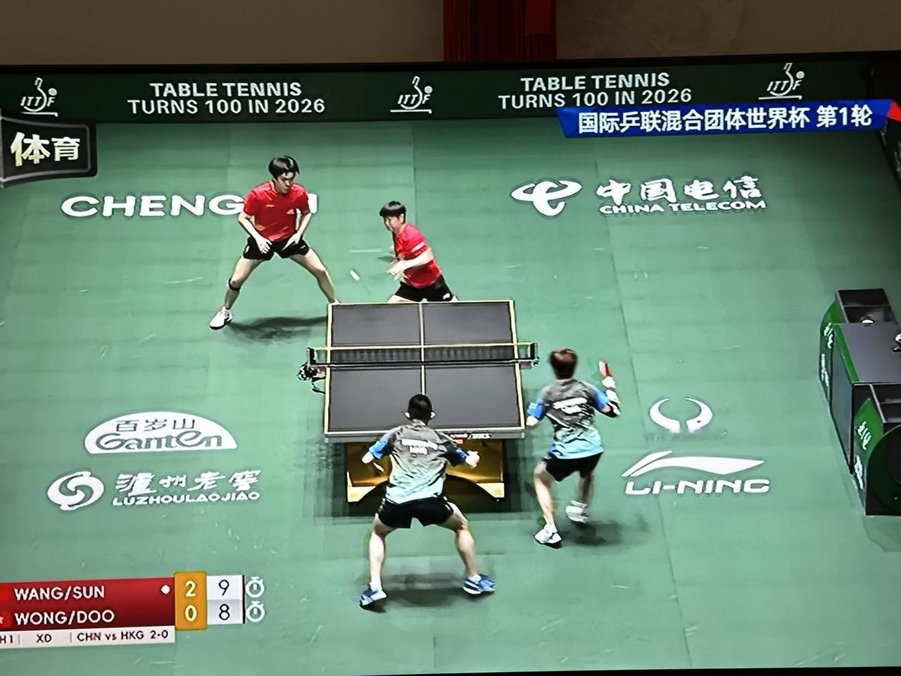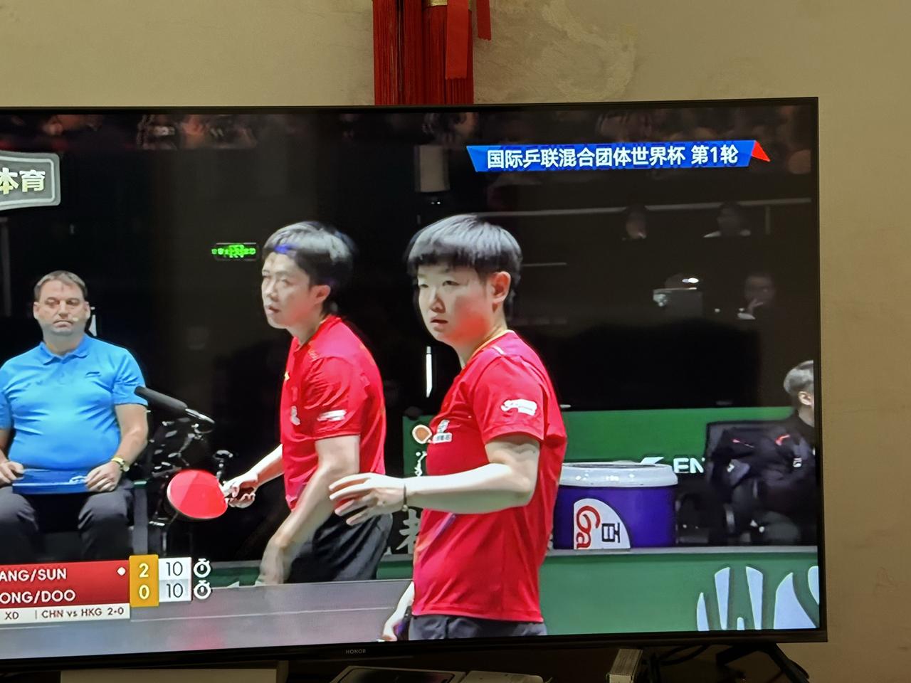 2025国际乒联混合团体世界杯就这样华丽丽地开赛了! 中午,我打开电视,调到中央台的体育频道,一打开,就看到了我最喜爱的一对球员:王楚钦和孙颖莎,一看就看到了他们的混双赛事,说是第一轮比赛,对阵方是香港队的一对混双选手,真是豪华阵容,更豪华的是,场外的教练居然是王皓和马琳同时在场。 我看的时候,莎头组合已经赢了两局,比赛已经到了第三局,第三局刚刚开始,这局的比赛有点胶着,对阵双方的比分交替上升,打到10比10的时候,香港队竟然领先一分11比10,莎头组合悄悄交换了一下眼色,相互心领神会,配合默契,连得2分,以12比10拿下第三局,以三比零的大比分赢得了这场比赛,使中国队收到了开门红的佳绩。 恭喜莎头组合!恭喜中国队!希望他们一直保持这样的状态获取最后的胜利!