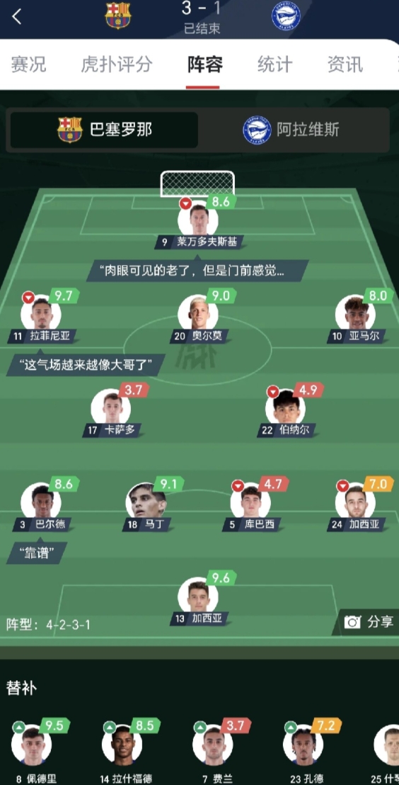 弗里克现在是越来越不适合巴萨,简直就是一招鲜。别看这场球赢了,赢得太艰难!如果没有霍安加西亚超神发挥,巴萨今天是一败涂地呀! 其实上赛季并不是巴萨的防线做得比现在出色很多,同样也是失了很多球,只不过是基本上都能用强大的进攻给掩盖住,这场拉菲尼亚回来了球队的进攻势头真的猛了很多! 弗里克的全攻全守,没有很强的身体素质就很难有创造力,现在这支巴萨太偏攻了,前面攻不进后场就拉跨,全靠门将兜底,这样打强队很容易被打成筛子。 最后我想说莱万还是替补吧,真的老了,明显跑不动,节奏慢,出脚慢,反应慢,现在就剩下比较强点临门一脚了。