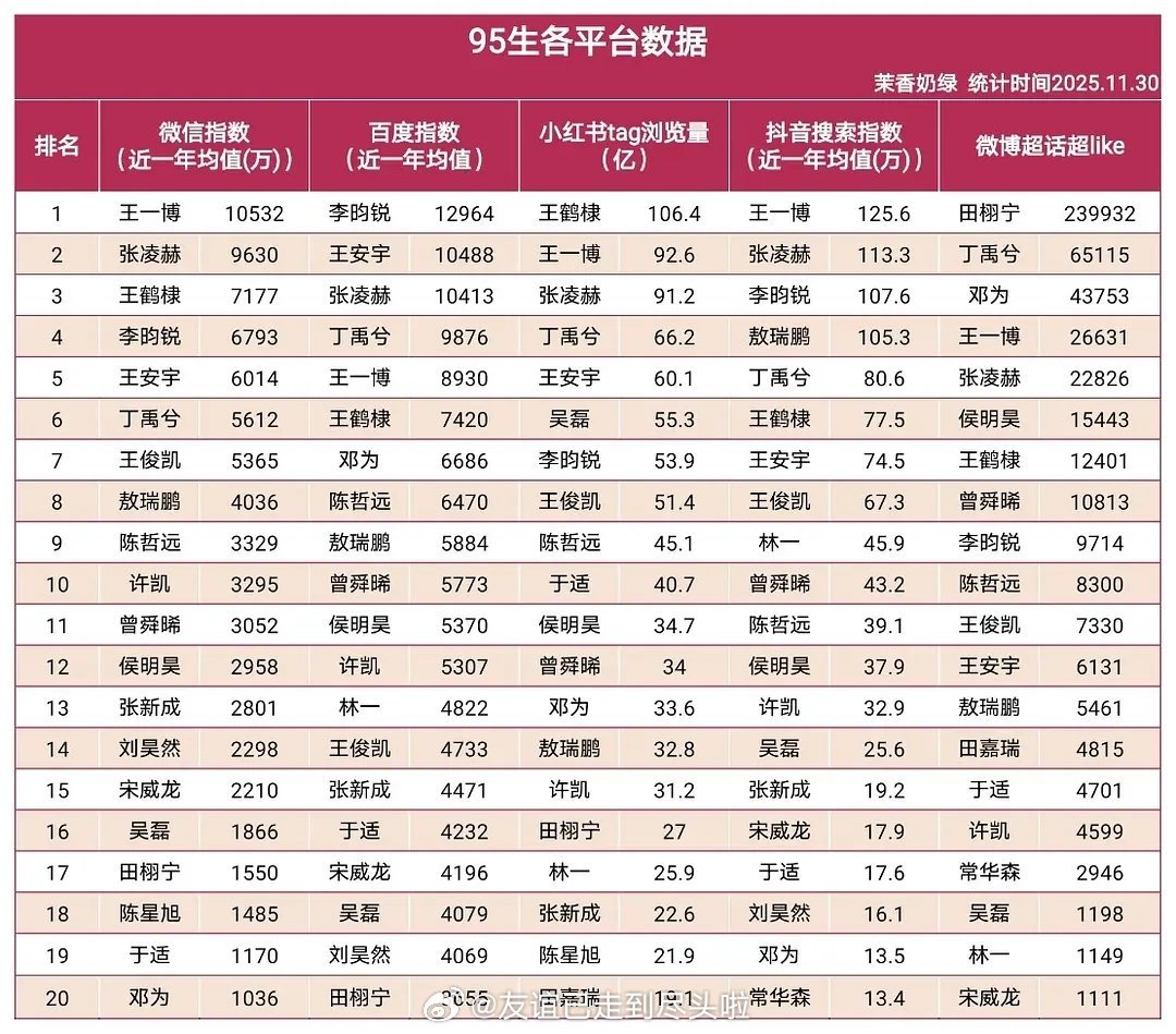 95生各平台数据能稳定在前五就只有王一博,张凌赫