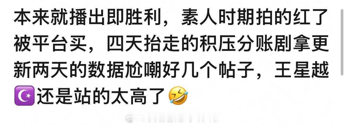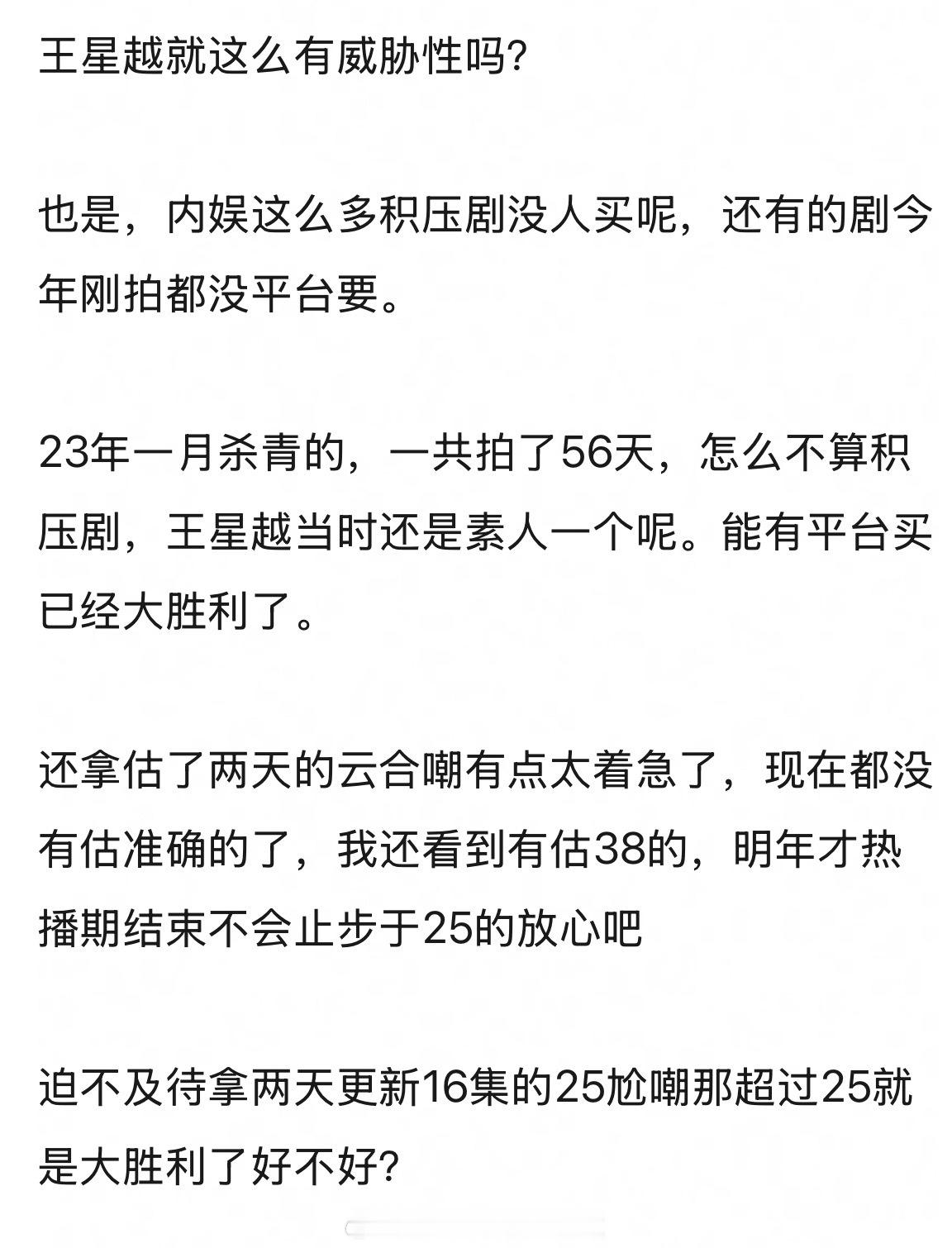 王星越的新剧,24集剧播了16集了,现在集均25万不过粉丝说这算素人时拍的剧,人红了以后被平台买的,23年拍了56天,能播就不错了