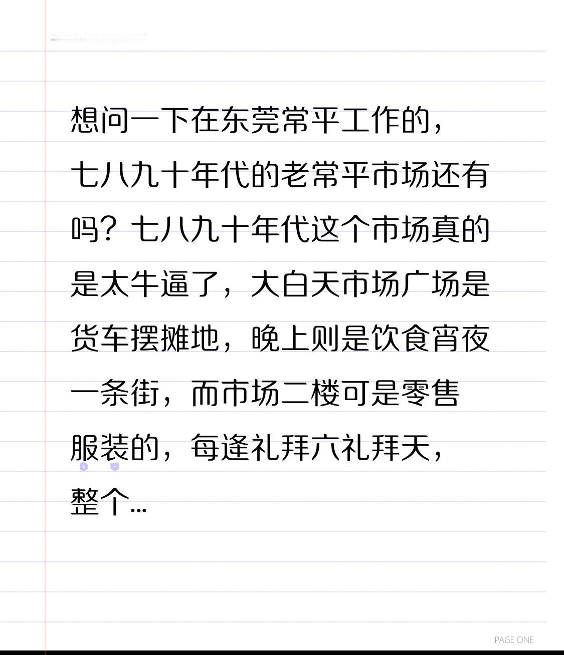 想问一下在东莞常平工作的,七八九十年代的老常平市场还有吗?七八九十年代这个市场真的是太牛逼了,大白天市场广场是货车摆摊地,晚上则是饮食宵夜一条街,而市场二楼可是零售服装的,每逄礼拜六礼拜天,整个二楼的服装区可真是人头涌涌的,而这里买衣服的商铺老板来自四面八方,但还是常平本地人居多,来这里买衣服的,如果摸了衣服,开了价不买的,这些商铺老板会把人骂的,甚至敢打人的,所以时不时会见有一些姑娘被骂哭的情况,所以来这买衣服的男男女女都十分害怕来这买成衣的,而这只是以前,换是现在的实体店是不可能有的事!