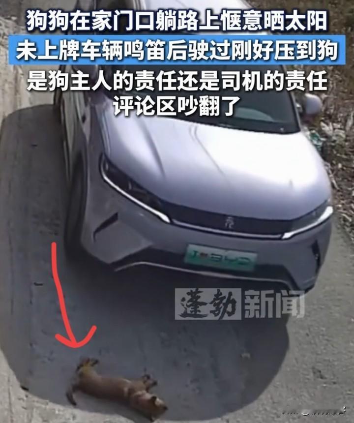 睡在家门口路中间的狗, 在司机鸣笛之后,没走所以被碾压了。 评论里各抒己见,都在争论到底是狗主人的责任,还是司机的责任。 有些网友说司机没错,是狗主人的问题,因为那个区域是盲区,司机都鸣笛了狗走没走,他怎么会知道。狗主人不栓好狗所以酿成这次惨剧。 而有些网友则说法律上不追究,但司机道德有问题,鸣笛了应该是知道狗在路中间,但不下车驱赶直接碾过去,是很残忍的。万一路中间的是个人,司机也这样,后果将会不堪设想。