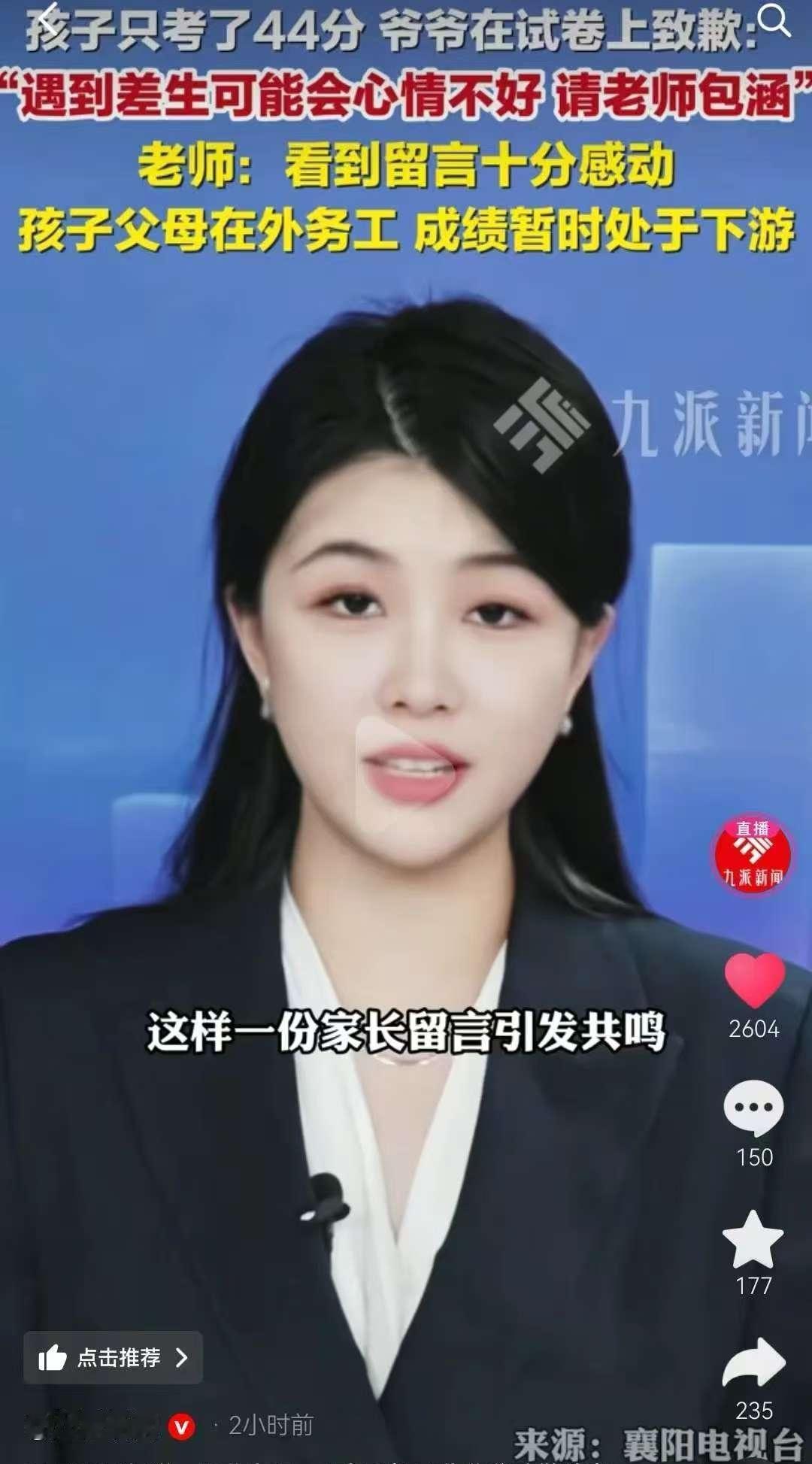 这下好了 上热搜了,全中国人都知道了 湖北一留守儿童只考了44分,爷爷写下的一行道歉语戳中了无数人的心:“遇到差生可能会心情不好请老师包含”。没有复杂的表达,只有最朴素的体谅,却让这场普通的小测验,变成了一次关于教育本质的深刻讨论。 很多人看到44分的成绩,第一反应就是贴上“差生”的标签,但很少有人留意到这背后的无奈与辛酸。 孩子的父母常年在外打工,撑起他日常起居的只有年迈的爷爷。老人或许连试卷上的题目都看不懂,辅导功课更是无从谈起,可他心里比谁都清楚,孩子的成长离不开老师的耐心引导。 这份看似“卑微”的道歉,哪里是承认孩子“差”,分明是长辈用尽全力,为缺失亲子陪伴的孩子争取一份被善待的可能,这份小心翼翼的用心,藏着最厚重、最无私的爱。 而邱老师的反应,更让我们看到了教育该有的样子。面对这样的留言,她没有被分数左右,反而被这份善意深深打动,没有标签化孩子,更没有忽视这份隔代教育的坚守。 其实教育从来不是一场只看结果的分数竞赛,而是用温暖唤醒温暖、用真诚浇灌成长的过程。成绩可以通过努力慢慢提升,但一颗被善待、被理解的心,才能支撑孩子在人生路上走得更远更稳。 爷爷教给孩子的体谅与尊重,邱老师展现的包容与共情,这些看不见的精神养分,远比一时的高分更有价值,更能滋养孩子的一生。 有人说爷爷太卑微,可这份小心翼翼的背后,是无数留守儿童家庭的真实写照,是隔代教育者的无奈与坚守;也有人夸老人明事理,认为好的家风就是最好的教育,远比试卷上的数字更重要。 在教育这件事上,分数从来都不是唯一的衡量标准,互相体谅的温暖、彼此尊重的默契,才是让孩子健康成长的关键,才是教育最本真的模样。