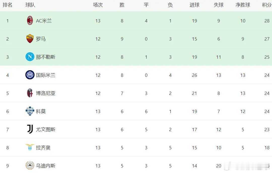 意甲最新积分战报:米兰超越罗马登顶,尤文逆袭,7队冲击冠军意甲第13轮进行了多场比赛。尤文图斯在主场完成逆袭好戏,以2-1击败了卡利亚里。塞巴斯蒂亚诺-埃斯波西托攻破了尤文图斯的大门。不过,很快尤文图斯就扳平比分。伊尔迪兹在禁区内抓住机会,抽射破门。之后伊尔迪兹依靠个人能力,强行突入禁区后把球打进,完成梅开二度。虽然卡利亚里在下半场进行大规模换人调整,但始终无法再次进球。20岁的伊尔迪兹用统治级的表现率领尤文图斯拿到3分。帕尔马在主场倒下了,以0-2输给了乌迪内斯。扎尼奥洛在第11分钟就攻破了帕尔马的大门。下半场特洛伊洛犯规被罚下。而乌迪内斯依靠点球机会扩大比分。帕尔马全场17次射门都无法转化为进球。热那亚在主场完成逆袭,以2-1击败了维罗纳。贝尔加利帮助维罗纳取得领先。洛伦佐-科隆博在第40分钟扳平比分。下半场托斯比的进球让热那亚反超比分。维罗纳太惨了,本赛季13场联赛连1场都没有赢。AC米兰在主场以1-0击败了拉齐奥。莱奥在第51分钟打进全场唯一进球。拉齐奥机会并不多,全场9次射门,都没有打进。米兰门将迈尼昂的表现很出色,他做出4次精彩的扑救,力保球门不失。AC米兰再次用经济实惠的比分拿下比赛。近4场比赛AC米兰保持不败,赢了其中的3场,都是以1-0的比分获胜,击败了罗马、国际米兰和拉齐奥这3支实力不俗的球队,拿到了非常关键的9个积分。五大联赛