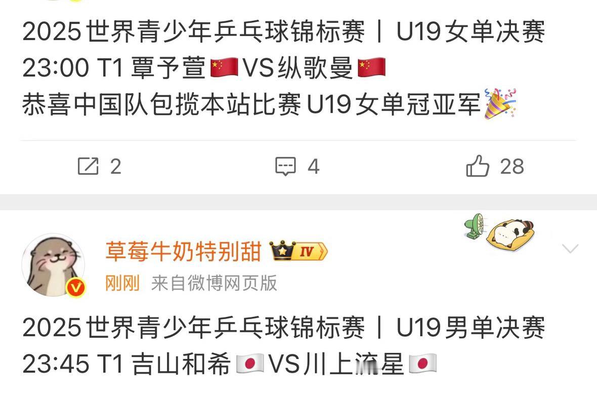 恭喜中国队包揽U19女单冠亚军—男单被日乒夺得,国乒男队的梯队建设加油吧! 11月30日,2025世青赛U19年女单决赛 覃予宣VS纵歌曼 U19男单决赛将在 吉山和希VS川上流星 两位日乒小将对决! 明年世界杯,世青赛女队参赛名额拿到了,男队是日乒的了! 川上喜欢王楚钦, 明年的小组赛川上也许会和偶像 打一场! 温瑞博没有打过川上, 决胜局5:4直通5:11…… 挺可惜的, 连追两局,决胜局没咬住! 温瑞博决胜局胜率比较低, 不稳定!
