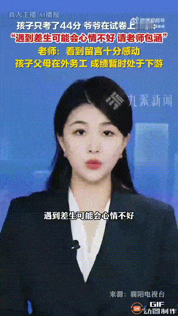 湖北襄阳宜城一个学生语文只考了44分,老师让学生把试卷带回家给家长签字,然后再收回去,谁料老师收回这个学生试卷的时候,在试卷上看到了一句话。 “老师,您好,遇到差生可能会心情不好,请老师包涵,谢谢!” 之后老师才了解到,这句话是学生的爷爷写的,因为学生的父母常年在外面工作,所以他一直都由爷爷照顾着,爷爷平时也需要干活,再加上文化有限,所以也无法好好地帮助孩子提升成绩,这才写下这句话,表达了心里对老师的歉意和感谢。 对此老师非常感动,她表示这个学生成绩不太理想,平时也有点调皮,但这只是一次小测验,相信他今后会慢慢进步的。 网友看完这段视频,都觉得这位爷爷的举动实在是太暖心了,作为孩子的监护人,他其实很明白孩子在学校的表现,除了学习成绩之外,性格也有点调皮,所以难免给老师增添麻烦,而他写下这句话的用意,就是理解了老师的辛苦,以此表达了内心的感谢和致歉,一切尽在不言中。 而老师会被感动,相信也是能够理解这位爷爷的辛苦,毕竟爷爷已经年龄大了,要照顾一个个性过于活泼的孩子,再加上文化程度和代沟的问题,所以有时候确实力不从心,但爷爷能写下这句话,也证明他很关心自己的孙子,也希望孙子更进步。 如今留守儿童的现象,其实在乡村里还是挺常见的,父母要出门打工挣钱,所以无奈把孩子留给爷爷奶奶照顾,这是很多家庭的困扰,但却无力改变,不过孩子成绩的提升也是一个大问题,希望父母也能考虑清楚,尽量做出改变,尽量多陪孩子。大家怎么看呢?