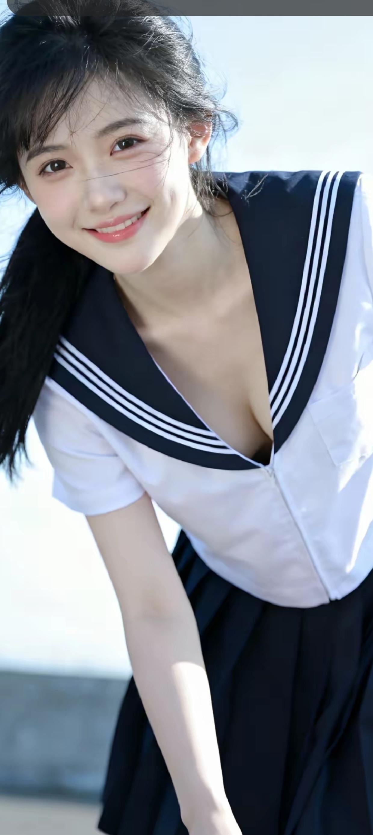 海边度假的甜美少女,笑容灿烂,白色花裙飘逸动人。