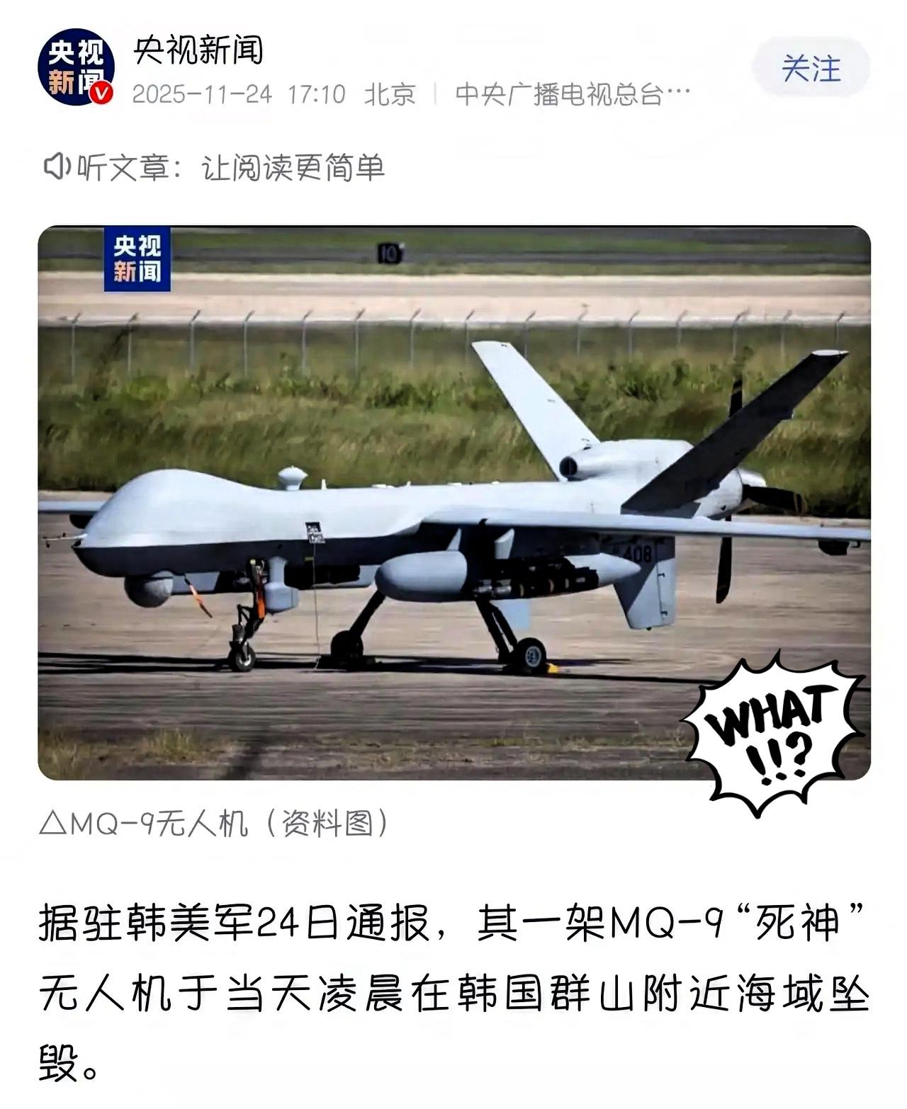 奇怪的是:价值3000万美元的美军无人机,一靠近中国就坠毁,关键是还两次,更蹊跷的是美军立马澄清是自己问题跟中国无关…… 一架3000万美元的美军无人机,刚飞进黄海就“失联”坠海;另一架从日本起飞,还没靠近钓鱼岛,返航途中就在自家机场摔成废铁。 更奇怪的是,以往一出事就甩锅中国的美方,这回却抢着澄清:“不是中方干的,纯属我们自己技术问题。”这反常的“主动认错”,反而让人忍不住多想:到底是什么让美军这次不敢往别人头上泼脏水? 过去几年里,MQ-9“死神”无人机在美军全球部署中频频出事。2023年底地中海那次,螺旋桨锁环提前磨损,导致整机失控坠海;2024年中东一次事故,竟是新手操作失误直接报废。 美国国会研究服务处早有报告指出,MQ-9的A类事故率(即损失超250万美元或全机损毁)远高于其他军用飞机。说白了,这款被吹上天的“察打一体王牌”,其实是个“高故障率选手”。 而最近这两起坠机,时间点太巧——正好撞在美国高调推进“2026第一岛链无人机监视网计划”的节骨眼上。日本刚把MQ-9派去钓鱼岛附近转一圈,回来就摔了;驻韩美军紧接着又派一架飞向中韩争议海域,结果也失控坠海。 韩国《Korea Times》披露,两架无人机都是彻底失联,地面控制完全失效,最后只能排空燃油、引导其坠入无人海域,避免砸到居民区。这种“连遥控都断了”的情况,显然不是普通机械故障能解释的。 有意思的是,美军这次反应异常迅速。驻韩司令部第一时间声明“未遭电子干扰”,日本防卫省也强调“排除人为因素”。要知道,过去只要美军装备在亚太出点状况,五角大楼和盟友媒体总爱暗示“中国干的”。 如今却急着撇清,是不是因为心里清楚:真要扯上“电磁对抗”或“技术反制”,反而会暴露自己侦察行动的敏感性和脆弱性?毕竟,黄海、东海这些区域,本就是中国海空监控体系最严密的地带之一。 再看价格,就更耐人寻味了。对外军售时,MQ-9卖给印度单价1.3亿美元,卖给卡塔尔更是飙到2.5亿一架。可美军自用版却只算3000万?差价背后,恐怕不只是配置差异,更涉及军火商层层加码的“政治溢价”。史密斯这类军工利益集团代表,在国会推动对台、对日韩军售时,拿的佣金恐怕比无人机零件还精密。 我觉得,这两起坠机事件暴露的不只是技术短板,更是战略误判。美军试图用老旧平台撑起高强度前沿侦察,就像拿十年前的手机跑最新AI大模型——硬件跟不上野心。如果继续迷信“技术霸权”,忽视系统可靠性和地缘现实,那所谓的“第一岛链监视网”,可能还没织完就自己散了架。 真正的安全,从来不是靠频繁抵近挑衅换来的。稳定需要互信,而不是一边喊着“防止误判”,一边把高故障率的武器开到别人家门口。 或许美军该想想:与其花几十亿买一堆容易掉链子的“空中眼睛”,不如坐下来谈规则、建护栏。这不仅能减少意外风险,也能避免把整个亚太拖入不必要的紧张漩涡。 各位读者你们怎么看?欢迎在评论区讨论。
