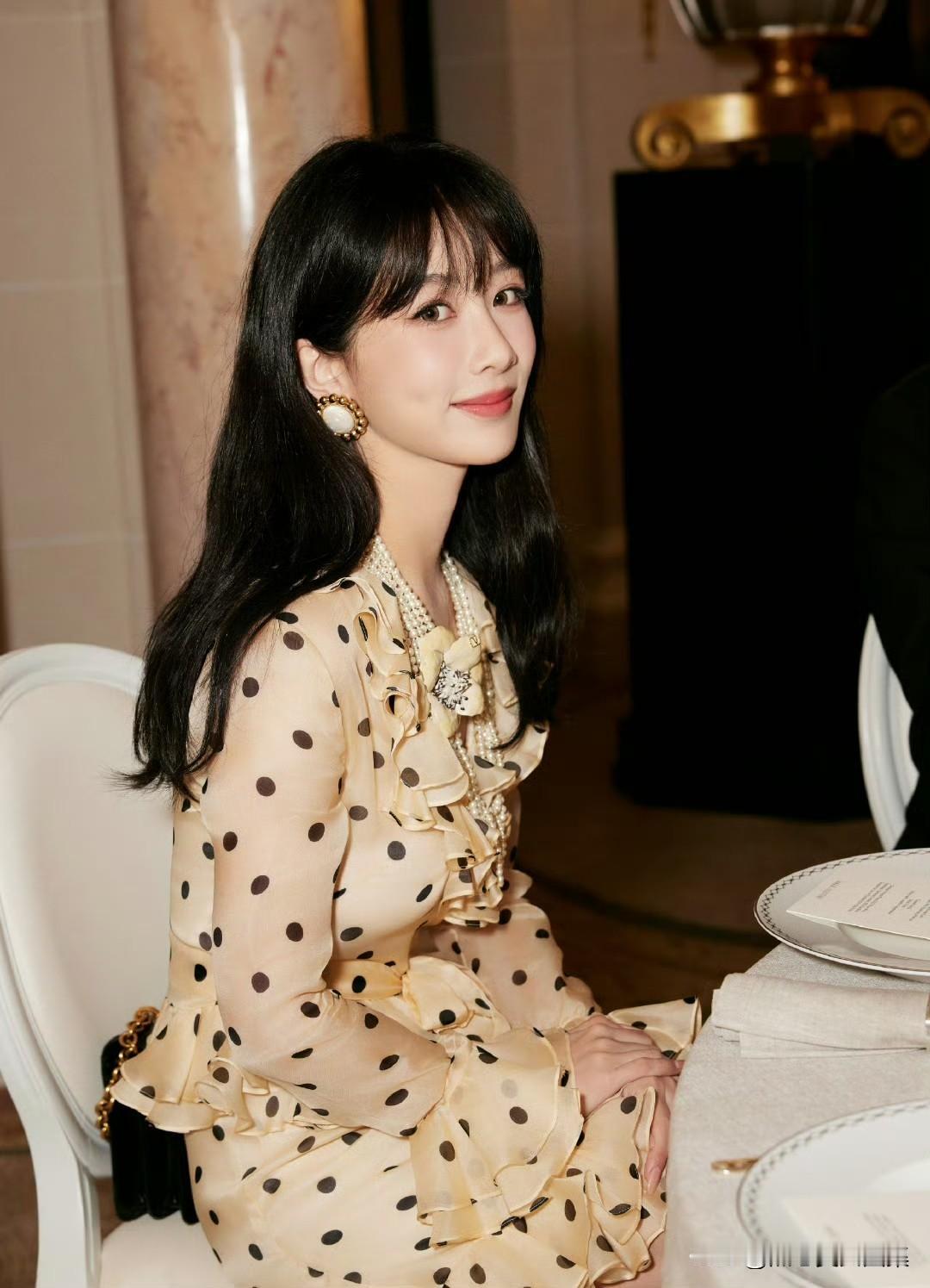 杨紫的波点白裙造型简直绝了,优雅与活泼完美融合。在某晚宴上,她这条波点裙获全网好评。米色打底配黑色波点,“低饱和+高对比小面积”很安全,有复古趣味又不过分甜腻。修身剪裁勾勒线条,走路时裙摆荷叶边轻晃,灵动感十足。黑色手提包上的金属光恰到好处,白色长筒袜配高跟凉鞋更是亮点,白与米色清爽干净,高跟妩媚压住长袜稚气。另外在巴黎时装周,她波点白裙搭荷叶领,配珍珠项链,将东方柔美与西方时尚结合,展现独特个人风格,不愧是时尚偶像! 杨紫美照 杨紫潮酷风 杨紫美图壁纸