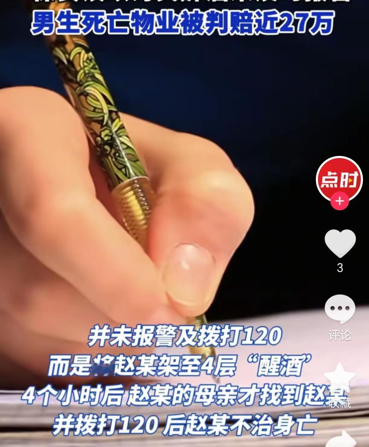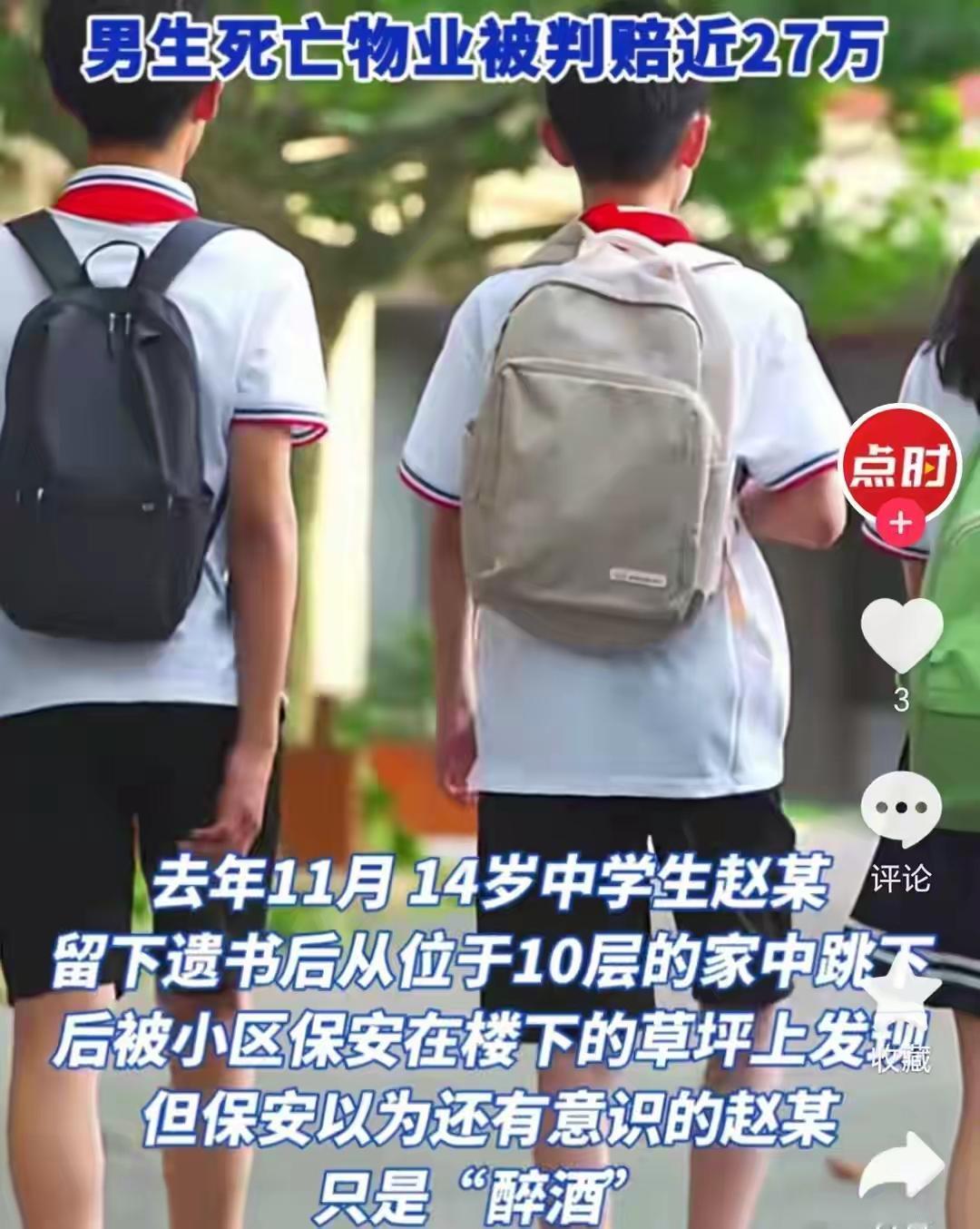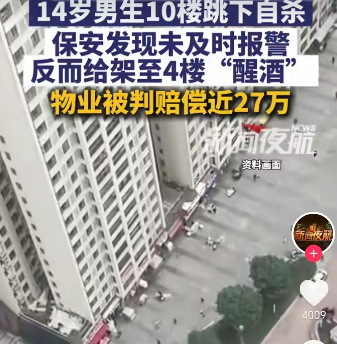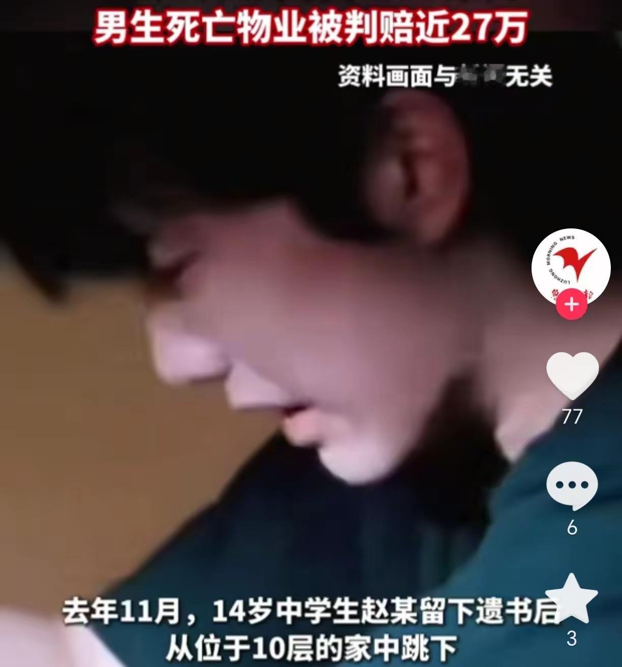 冤不冤! 河南许昌14岁中学生小赵,因为生活琐事和父母吵嘴后想不开,从自己家所住的10楼跳了下来,没想到落倒了柔软的草丛上,摔得全身动弹不得,躺在了那里! 过了一会儿,小区里的保安老李和老孙路过这里,发现小赵躺在那里以为他是喝醉了,就问他要不要打110和120,听到小赵说不需要后他们就把小赵扶起来,准备送他回家。 可不知道是小赵因为受伤说的不清楚,还是俩保安没听清楚,他们将小赵送到了401的门口就走了。可实际上小赵住在10楼的1001。 小赵的父母发现他留下的遗书后,开始发疯似的寻找他,可直到晚上9点钟,才在401的门口找到了小赵,紧急送医后,也就过了一个小时的时间,小赵就不行了! 愤怒的小赵父母将物业公司告上了法庭,索赔84万!物业公司却反复强调自己已经尽到了责任,由于当时小赵明确强调不用拨打报警电话和120,他们不能不尊重业主的意思! 一审法院认为,物业具有履行协助救助职责不力而贻误抢救的行为过错,需要承担30%的责任,判令赔付小赵父母26.9万多元! 如果小赵父母和孩子争吵后及时关注他的情绪,如果保安不想当然的认为小赵喝醉了,如果401的业主有事情需要出门看到他,或许悲剧就不会发生了!可多种因素叠加,一个年轻的生命就永远的消失了! 你认为物业赔偿冤不冤呢?
