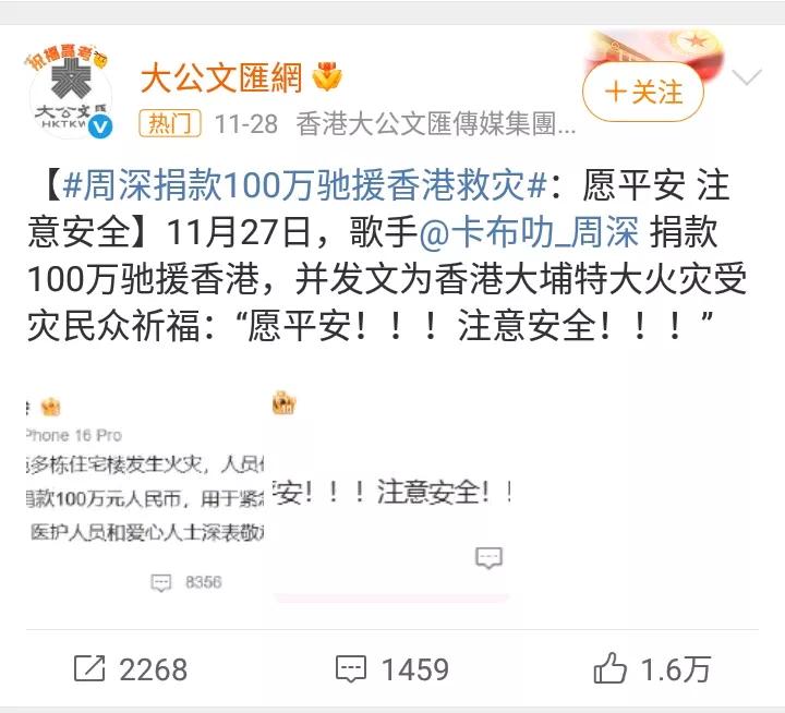 周深捐款100万驰援香港救灾,有一个小细节引人关注! 那就是100万,对于香港受灾同胞来说,究竟有多重要? 100万,可以买很多食物。 100万也可以买很多过冬的衣服。 100万的用途很大。 但是,周深的想法,却再一次告诉大家! 一方有难八方支援! 100万给到受灾同胞,才是暖心的举动!