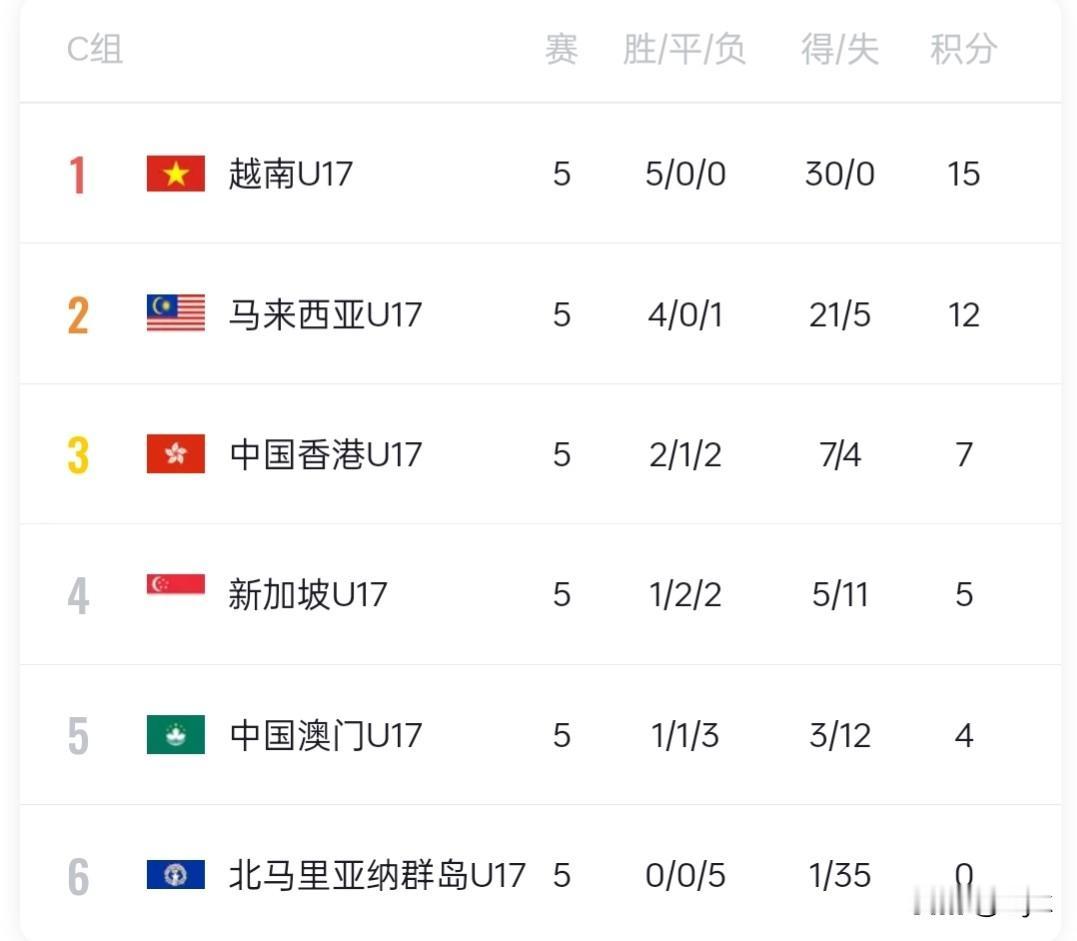 U17亚洲杯预选赛中国刚刚以4-0战胜孟加拉国,一个小时后, C组的越南也以4:0战胜马来西亚, 同样以5战全胜, 同样失0球的成绩获小组第一, 拿到亚洲杯和世界杯门票。 复盘这五场比赛, 首轮6:0碾压新加坡U17起手即高能; 次轮14:0血洗北马里亚纳群岛U17, 进攻火力直接拉满; 第三轮2:0稳胜中国香港U17, 攻防节奏完全拿捏; 第四轮4:0轻取中国澳门U17, 状态全程在线; 最后这场4:0赢马来西亚, 直接锁定头名。 中国和越南的这批年轻人表现亮眼, 两队的青训成果有目共睹。 期待在亚洲杯正赛上继续发力, 带来更多精彩表现, 再创佳绩!
