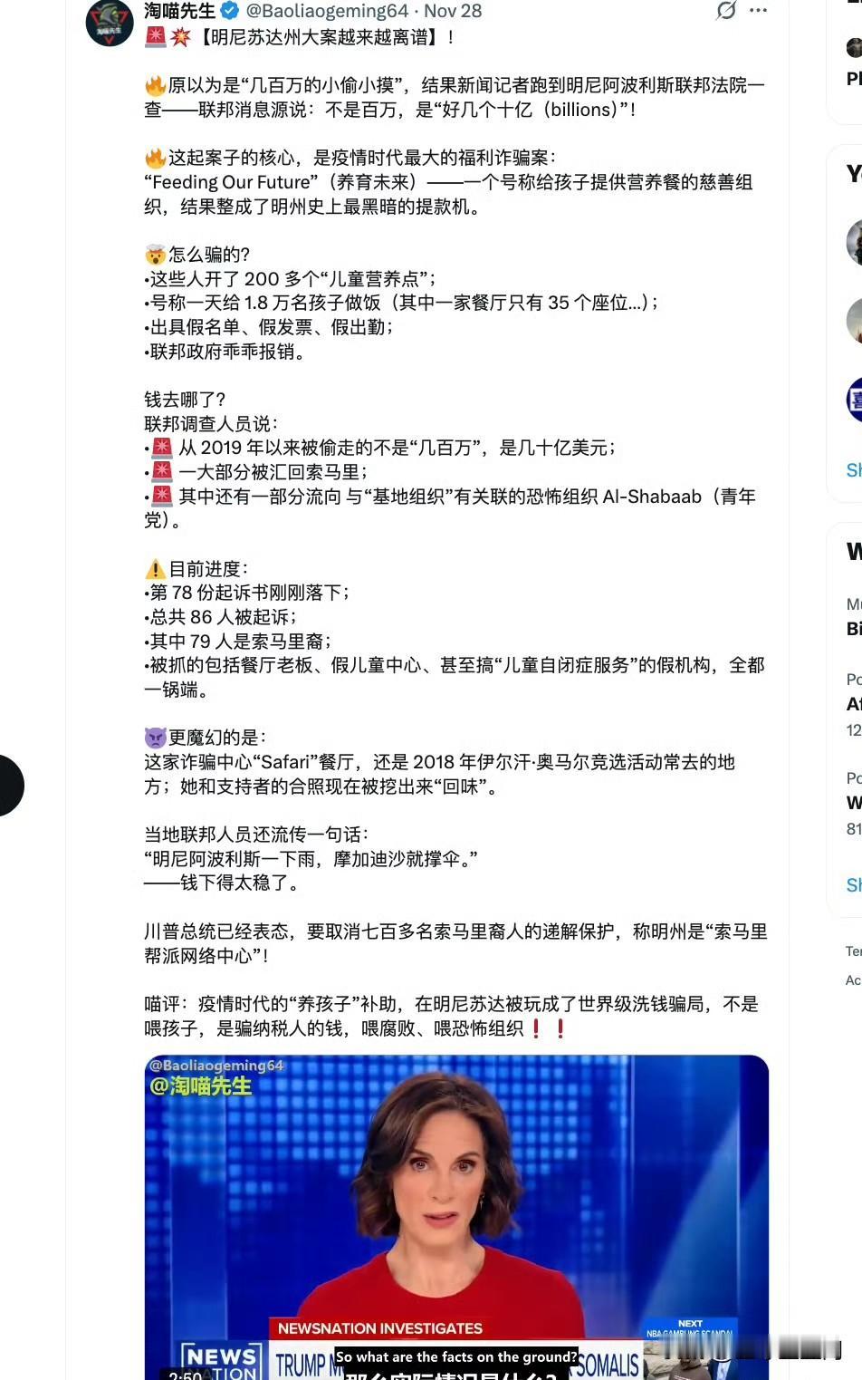 明尼苏达那个“喂饱孩子”的慈善项目,原来是美国史上最大福利诈骗案: 2500万刀只是冰山一角,实际掏空纳税人超30亿美金! 200多家“餐厅”一天报1.8万孩子吃饭,一家35座的小店也敢领千万,名单发票全是假的,钱直接买了豪车豪宅、汇回索马里,甚至喂了Al-Shabaab恐怖组织。 到现在78人被起诉,79个都是索马里裔,最高判28年。 老川发怒:取消700多名索马里裔的保护身份,点名明州是“索马里帮派洗钱中心”。 更离谱的是,诈骗核心Safari餐厅还是伊尔汗·奥马尔2018年竞选常去的“根据地”,旧照全被挖出来回味。 纳税人喂孩子?不,是喂了全世界最黑的产业链。 奥马尔明知明尼阿波利斯索马里社区诈骗成灾、资金外流喂恐怖组织,却几年如一日跟诈骗窝点Safari餐厅称兄道弟、收钱拍照、帮洗白。纳税人30亿美金被偷,她连句硬话都没有,反而写信替“被冤枉”的同乡喊冤。这不是无知,这是故意失明。选区成美国最大的福利黑洞,她就是最大的政治遮羞布。