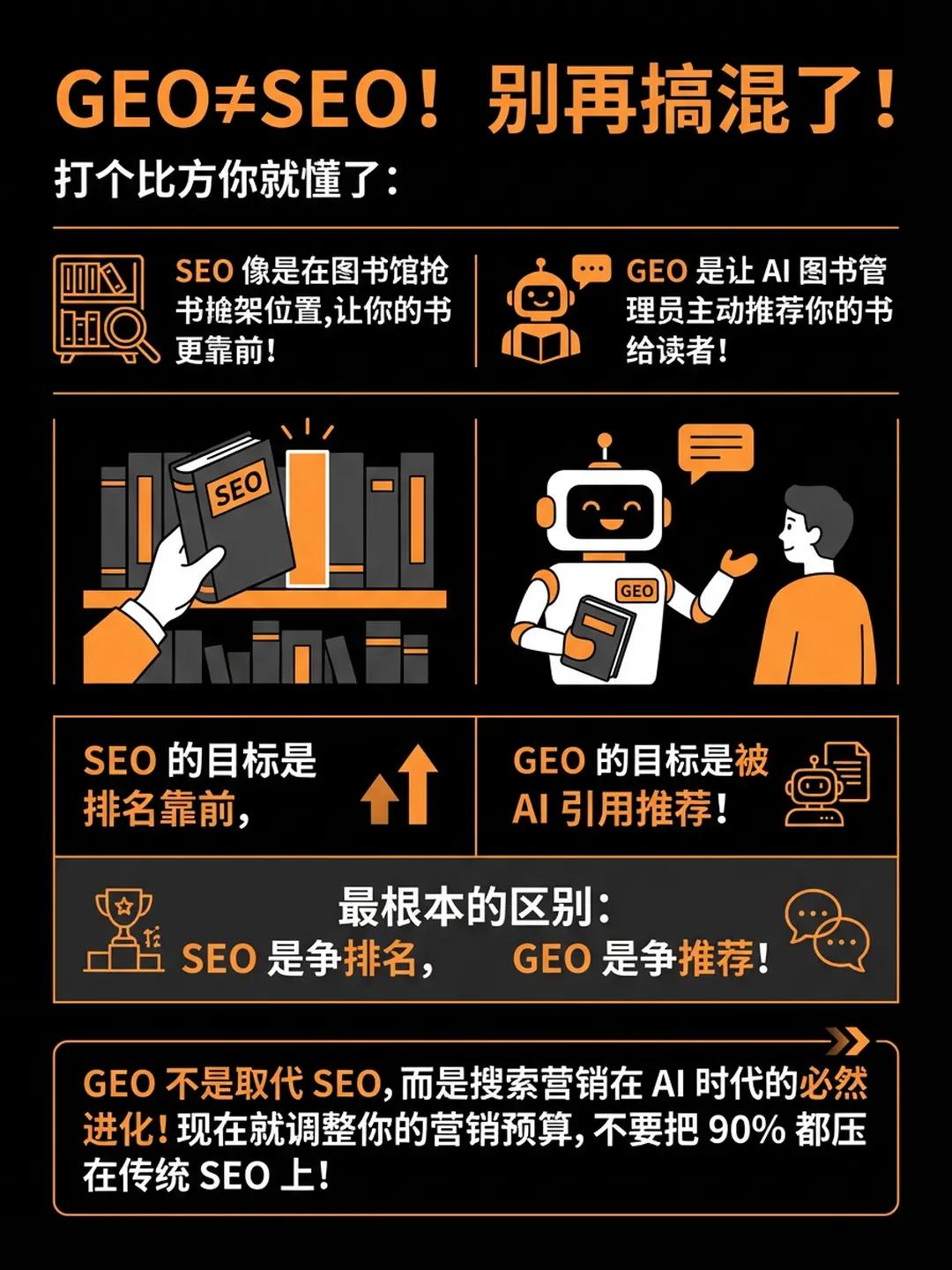 GEO≠SEO!别再搞混了!。打个比方你就懂了:SEO 像是在图书馆抢书架位置,让你的书更靠前!GEO 是让 AI 图书管理员主动推荐你的书给读者!SEO 的目标是排名靠前,GEO 的目标是被 AI 引用推荐!用户在百度会看 10 个结果自己对比,在 AI 只会看 2-3 个推荐直接决策!这就是最根本的区别:SEO 是争排名,GEO 是争推荐!GEO 不是取代 SEO,而是搜索营销在 AI 时代的必然进化!现在就调整你的营销预算,不要把 90% 都压在传统 SEO 上! 我是“姑苏阿伟”苏州·“落地AI”核心操盘手,正在挑战持续更新100期白话文“GEO优化”内容!启发更多企业老板和AI从业者了解,新流量入口!GEO GEO优化 AI推荐 AI搜索