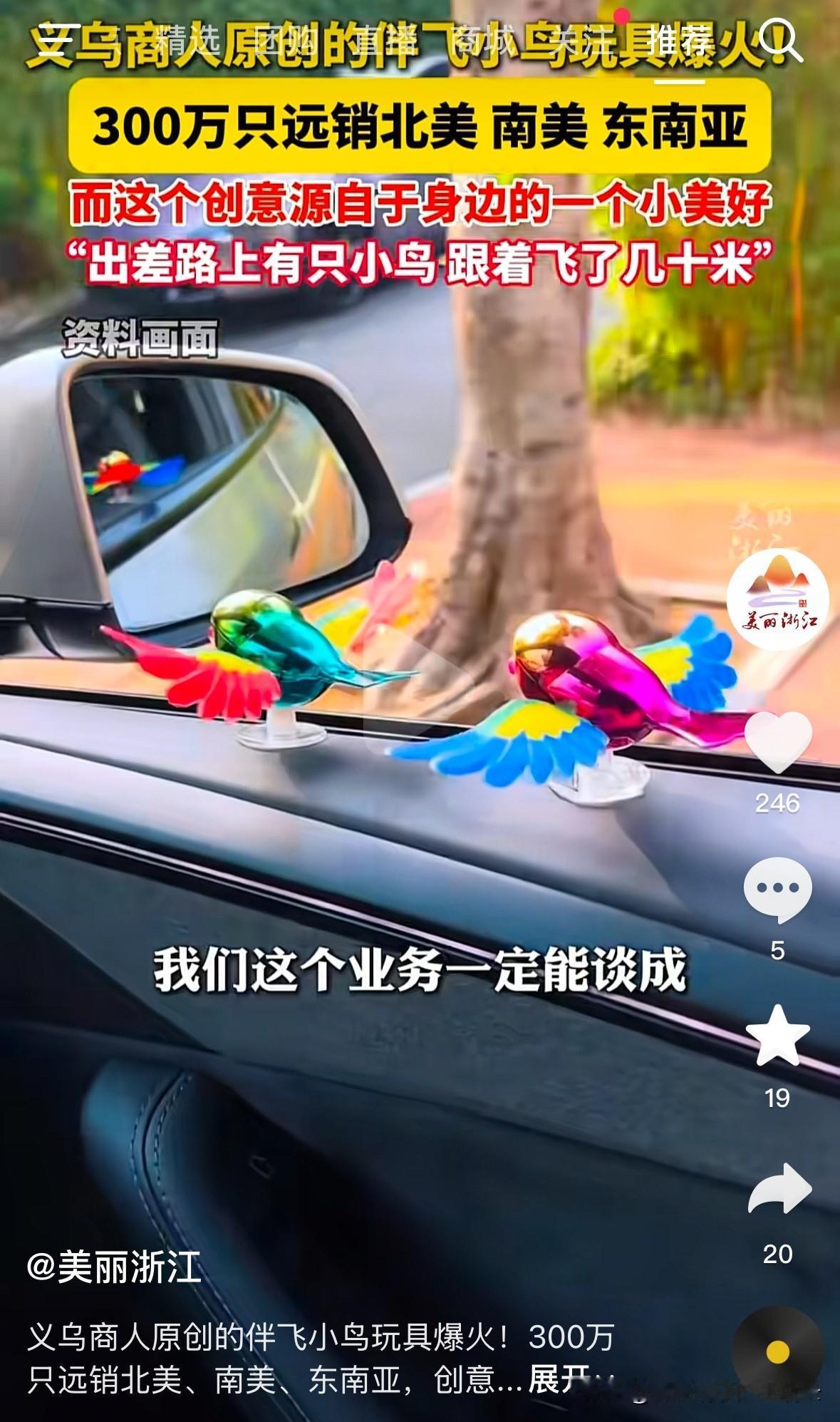 怪不得浙江都那么富裕,原来他们头脑如此聪明! 刚刚刷到一个视频,义乌的一个商人自创了一款爆火的伴飞小鸟玩具,此产品远销国外,每次到货都抢购一空,而这个创意来源于身边的一个小美好。 原来,他开车到云南谈生意,在开山路的时候,有只小鸟跟着他们的车,紧挨着车窗边飞了几十米。 出差回来后,他把这次偶遇的美好赋予到作品里,作废了8副模具后,小鸟终于起飞了。 他们的小玩具主要销往南美,东南亚,他们的货一到,大家都在抢货,目前共销售了300万只。 不得不说,五彩斑斓的小鸟做的活灵活现的,把它粘在车上特别吸睛。一般人遇到小鸟跟随的情况,只会感叹一声,很少有人会把它做成玩具。 他称要有一双善于发现美的眼睛,能发现身边的小美好,才能给作品赋予生命。所以大家出门在外时,要多注意观察周围,万一商机就在不远处呢。