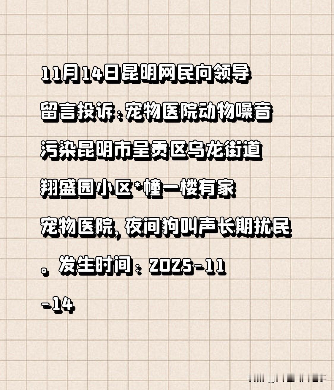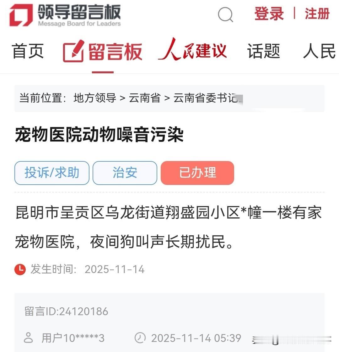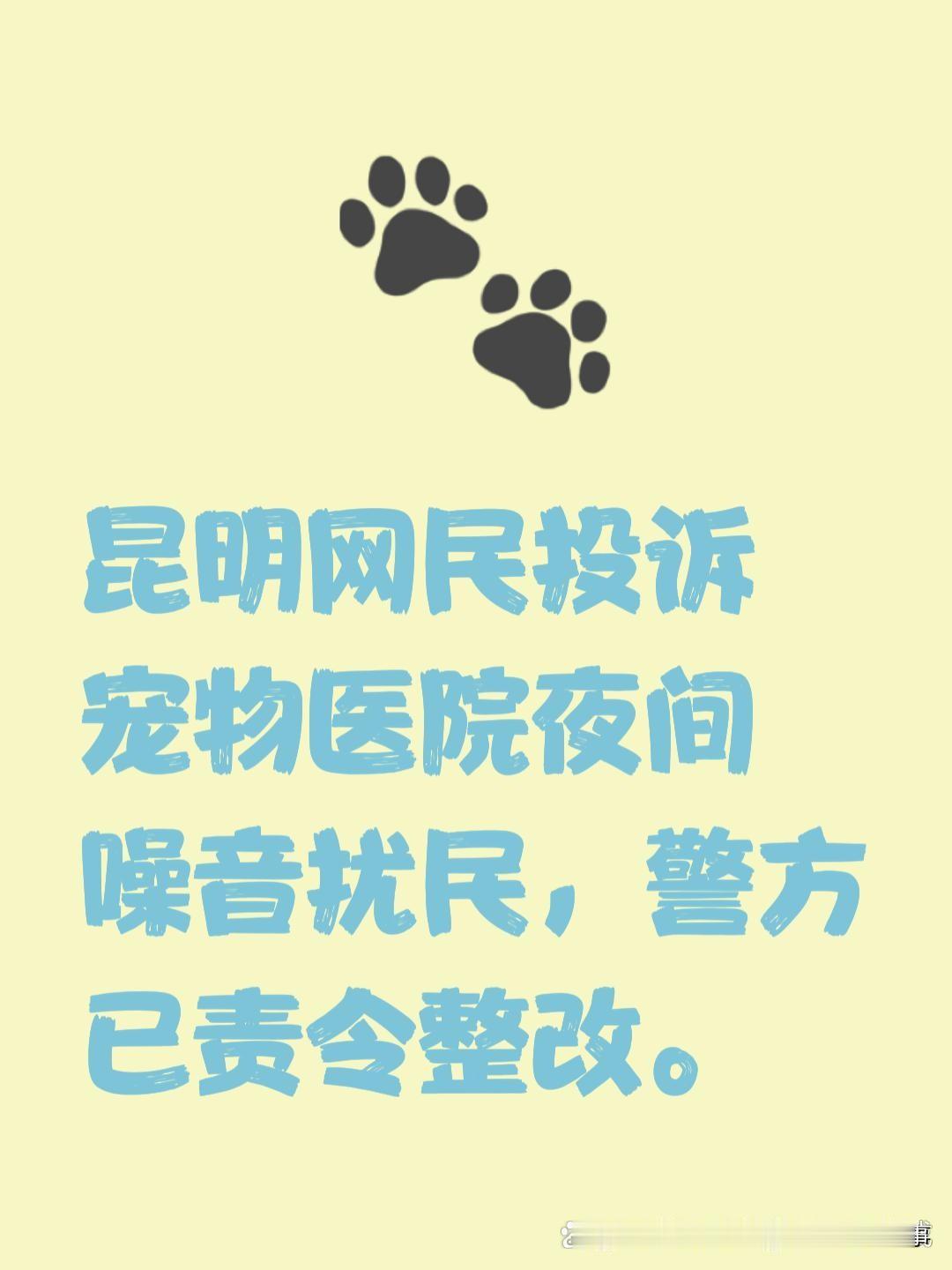 【网民投诉宠物医院噪音扰民】→ 11月14日,昆明网民向领导留言投诉:宠物医院动物噪音污染 🐶昆明市呈贡区乌龙街道翔盛园小区*幢一楼有一家宠物医院,夜间狗叫声长期扰民。 发生时间:2025 - 11 - 14 2025年11月28日19:00 昆明市公安局呈贡分局官方回复 网民同志:您好! 🐕您反映的呈贡区乌龙街道翔盛园小区*幢一楼宠物医院夜间狗叫声长期扰民问题,我们已收悉。 🐕🦺经昆明市公安局呈贡分局乌龙派出所核实,该宠物医院确实存在噪音扰民情况,乌龙派出所已依法向其下发《责令限期整改通知书》。 感谢您的理解与支持,祝您身体健康、生活愉快! 扰民赔偿 宠物噪音 📖【法律依据】宠物医院扰民问题可通过协商、投诉或法律途径解决,核心在于依据《民法典》等法规维护自身权益。 宠物医院