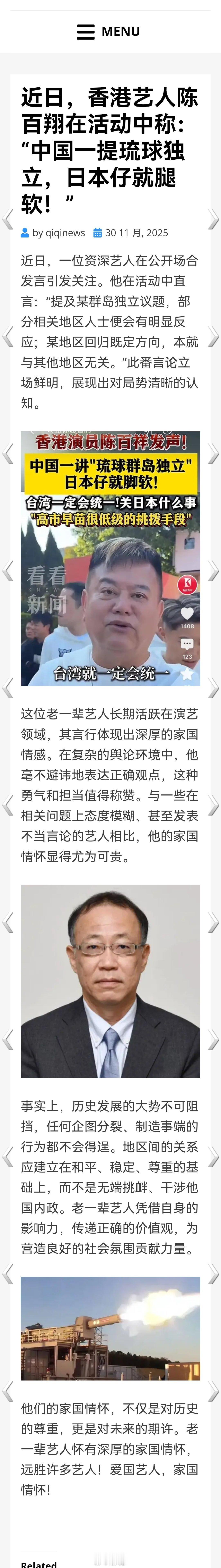 近日,香港艺人陈百翔在活动中称:“只要中国一提琉球独立,日本仔就腿软!”高市早苗再次有意犯错海外新鲜事何天恩多国最新涉台表态